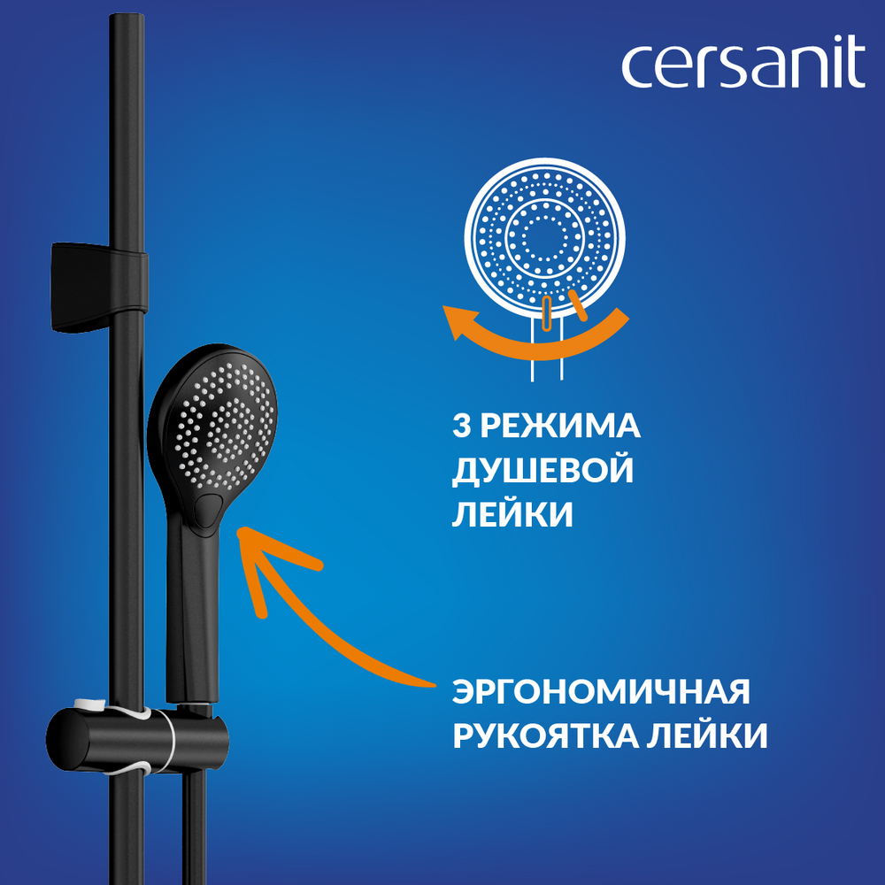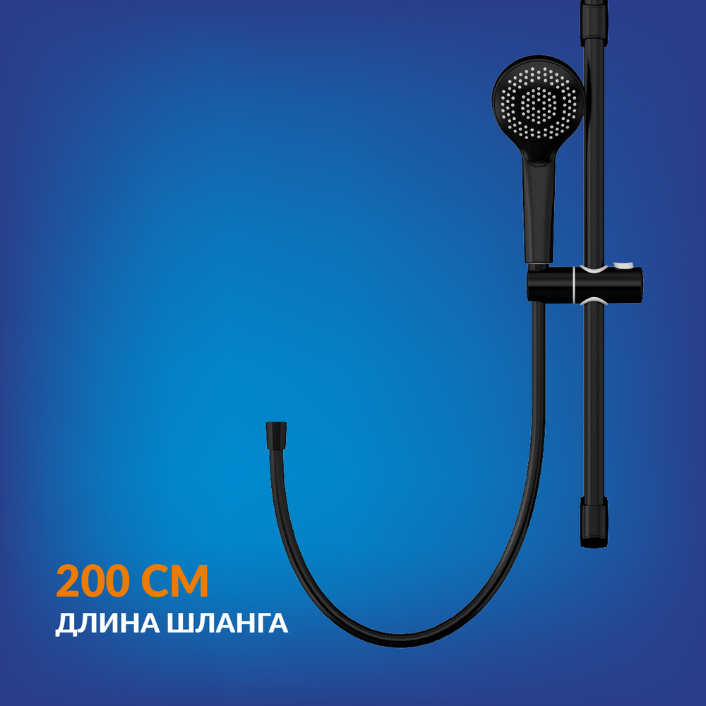 Чёрное матовое покрытие душевой системы выполнено методом электрофореза, благодаря чему не боится влаги. Матовая поверхность не деформируется и не теряет эстетических качеств под воздействием воды и солей. Такой смеситель прослужит дольше и сохранит свой первоначальный внешний вид годами. Модный дизайн и черное матовое покрытие придают душевой системе актуальный внешний вид, а удобное управление придется по душе всем членам семьи.