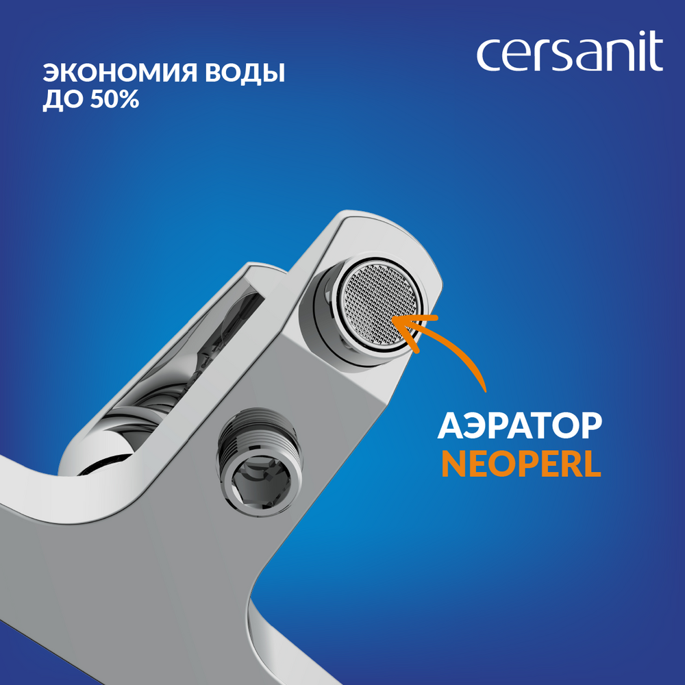 Аэратор Neoperl позволяет экономить до 50% воды и формирует струю в ровный мягкий поток без брызг. Первозданный блеск обеспечивает никель-хромовое покрытие Cersanit Super Shine, прошедшее тестирование в течение 200 часов в нейтрально-солевой среде.