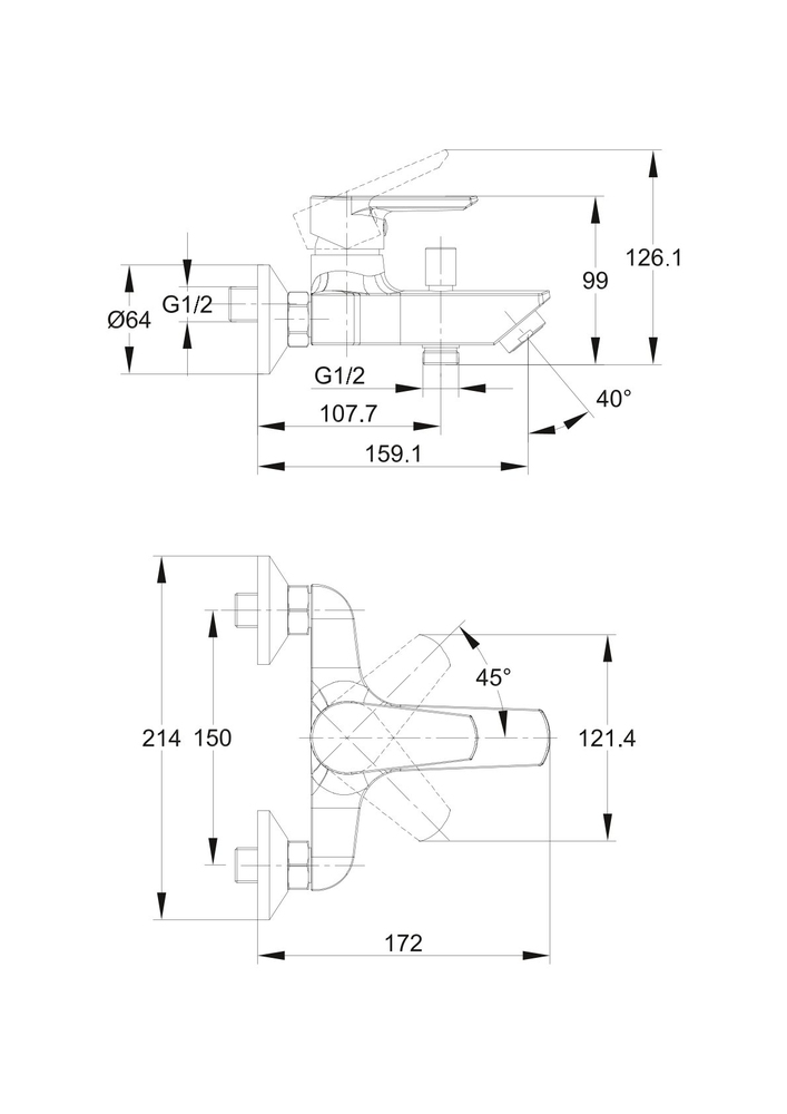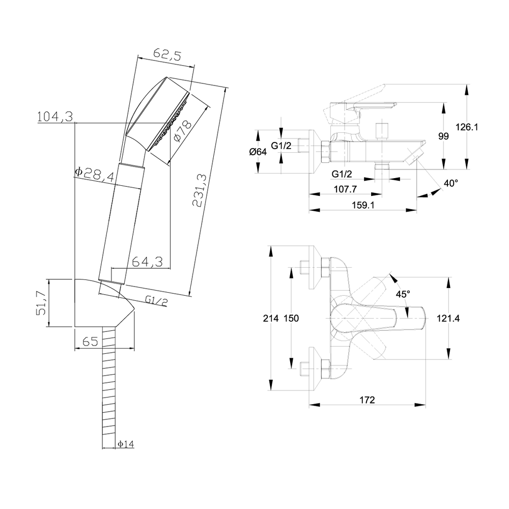 смеситель для ванной, душевой набор (душевая лейка, держатель лейки, душевой шланг); S-образные эксцентрики 65 гр., крепеж