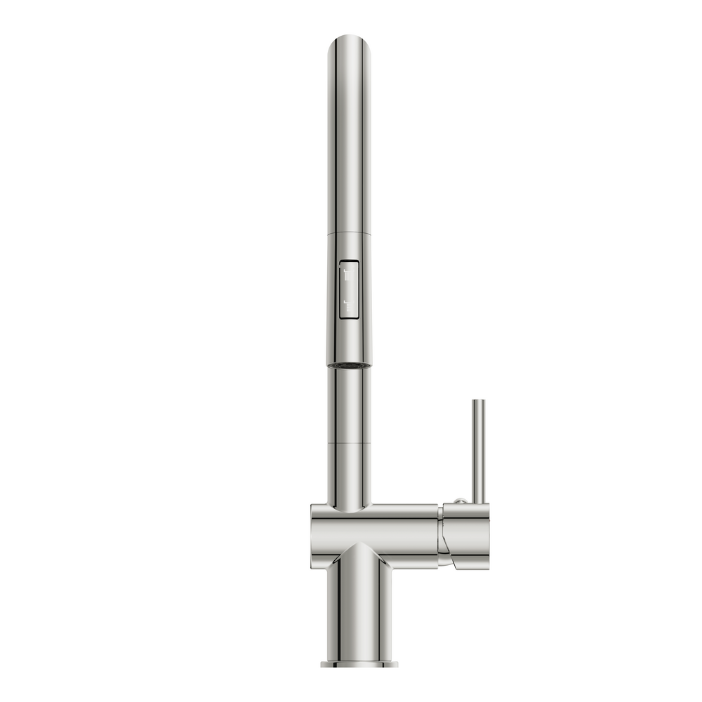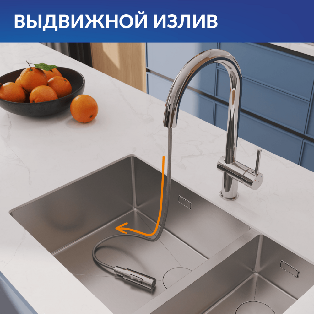 Выдвижная лейка позволяет решать целый спектр задач, от мытья раковины, посуды и овощей до заполнения водой ёмкостей, которые не помещаются в раковину. Чтобы воспользоваться ею, достаточно просто потянуть душ на себя. Длина шланга регулируется, а сам душ можно поворачивать в любую сторону. При всей своей функциональности это приспособление не занимает много места и не лишает смеситель изящности.