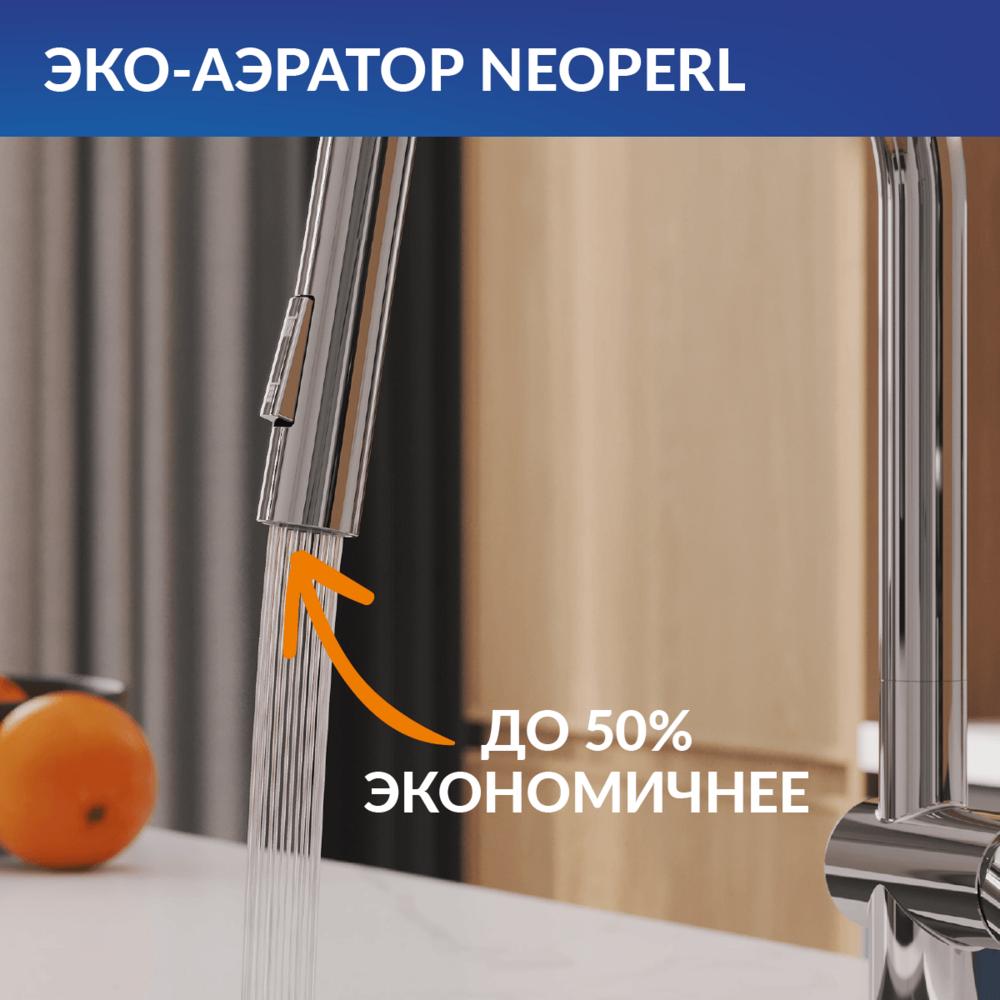 Излив смесителя поворотный — его можно вращать на 360 градусов и направлять струю воды именно туда, куда нужно. Смеситель оснащен аэратором Neoperl, который обеспечивает стабильно ровный поток воды даже при плохом напоре. Он позволяет экономить до 50% воды по сравнению с обычными смесителями.