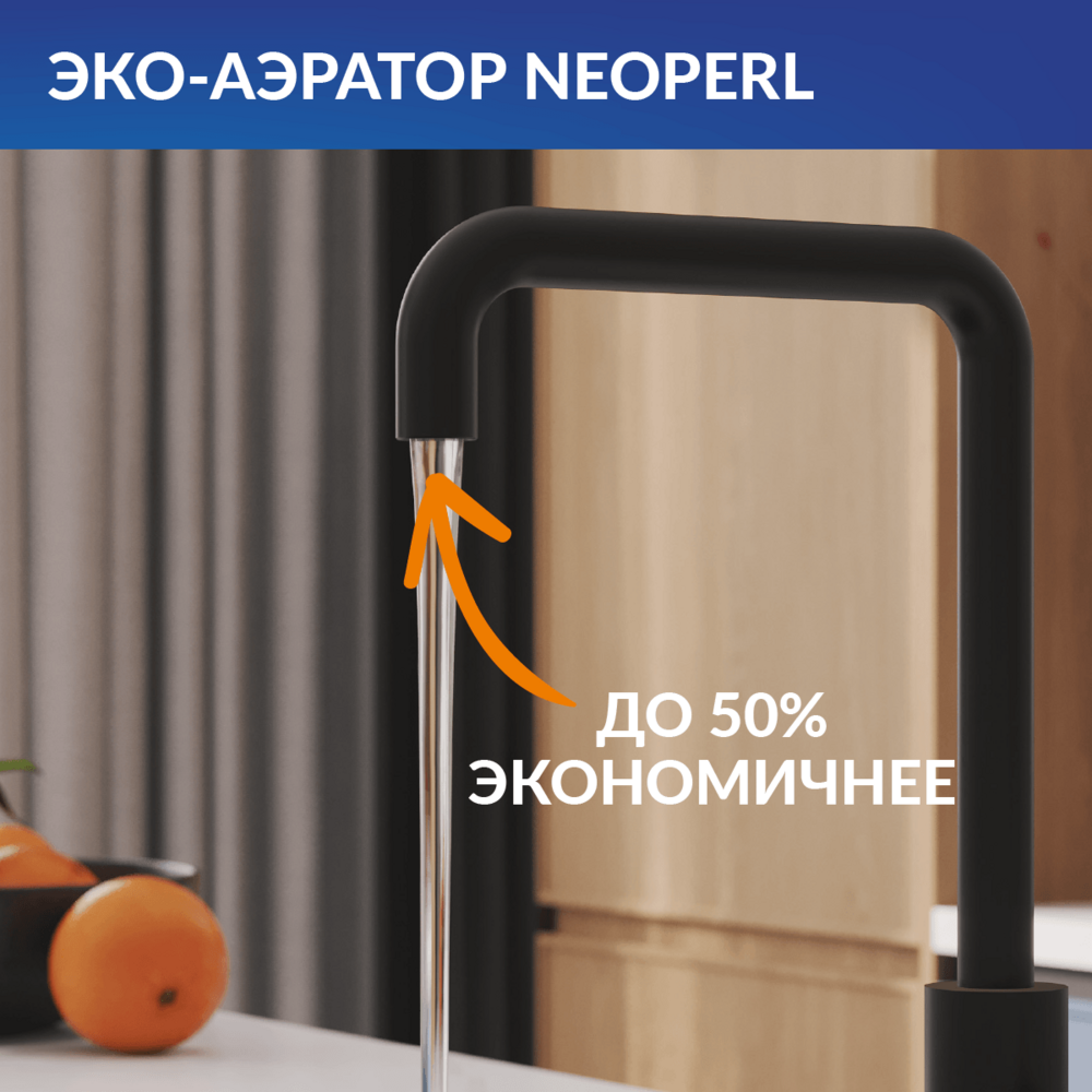 Излив смесителя поворотный — его можно вращать на 360 градусов и направлять струю воды именно туда, куда нужно. Смеситель оснащен аэратором Neoperl, обеспечивающим стабильно ровный поток воды даже при плохом напоре. Он позволяет экономить до 50% воды по сравнению с обычными смесителями.