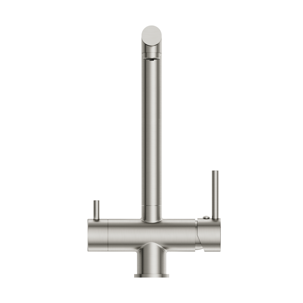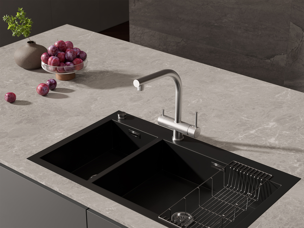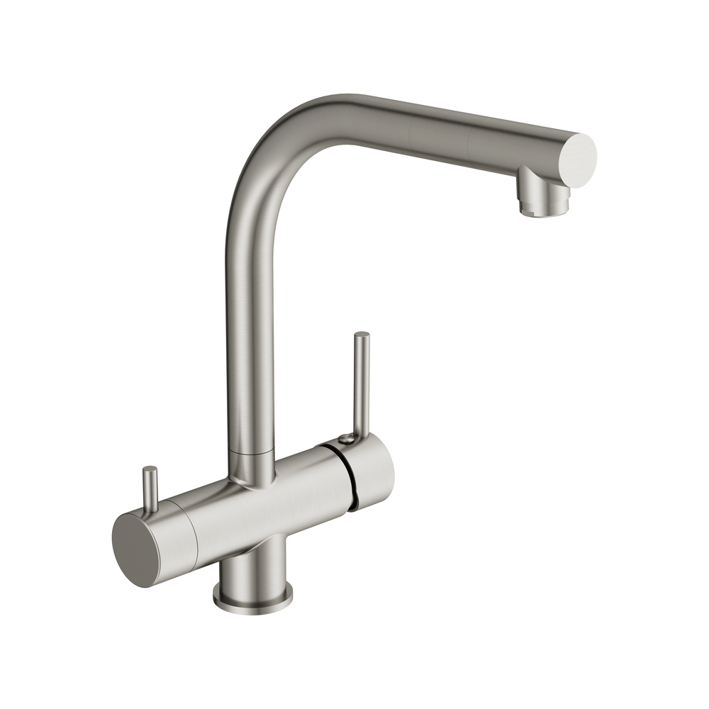 Смеситель предусматривает возможность подключения фильтрованной воды. Проточная и фильтрованная вода включаются двумя разными ручками. Функция позволяет экономить место на кухне, средства на поиск дополнительного оборудования и сохранить в целости поверхность, на которую устанавливается смеситель.