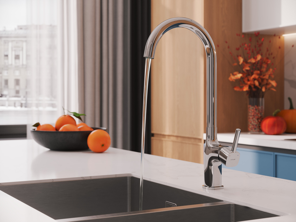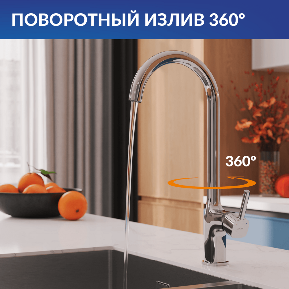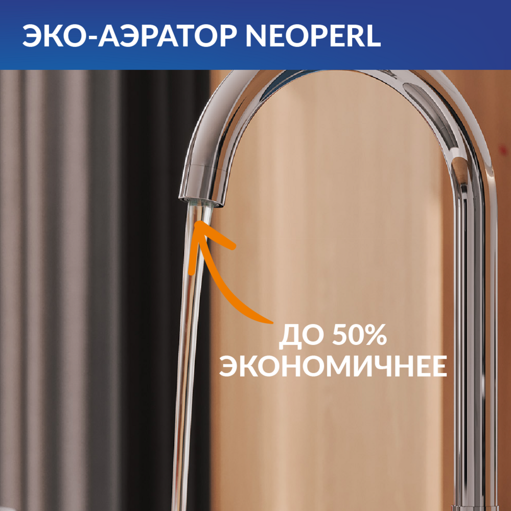 Излив смесителя поворотный — его можно вращать на 360 градусов и направлять струю воды именно туда, куда нужно. Смеситель оснащен аэратором Neoperl, который обеспечивает стабильно ровный поток воды даже при плохом напоре. Он позволяет экономить до 50% воды по сравнению с обычными смесителями.
