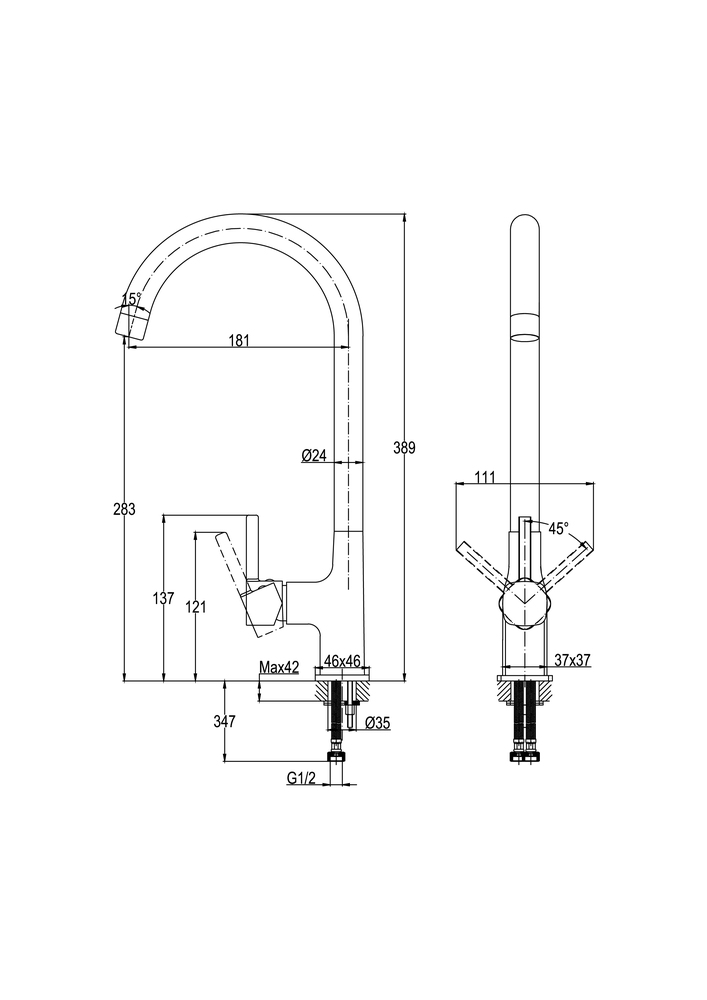 Смеситель оснащен стандартной подводкой с диаметром подключения 1/2 дюйма, что избавляет от трудностей при монтаже.