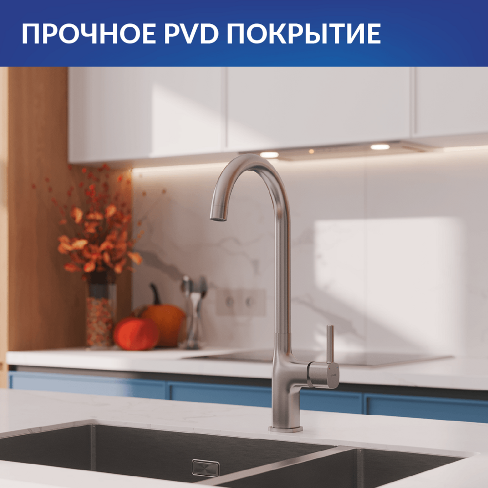 Простой и элегантный дизайн смесителей Elio подойдет тем, кто выбирает минимализм. Стильное и современное оборудование для кухни будет служить безотказно долгие годы. Стойкое покрытие PVD будет радовать красотой долгие годы. За такими смесителями просто ухаживать, для поддержания эстетичного внешнего вида достаточно лишь стирать капли воды после использования.