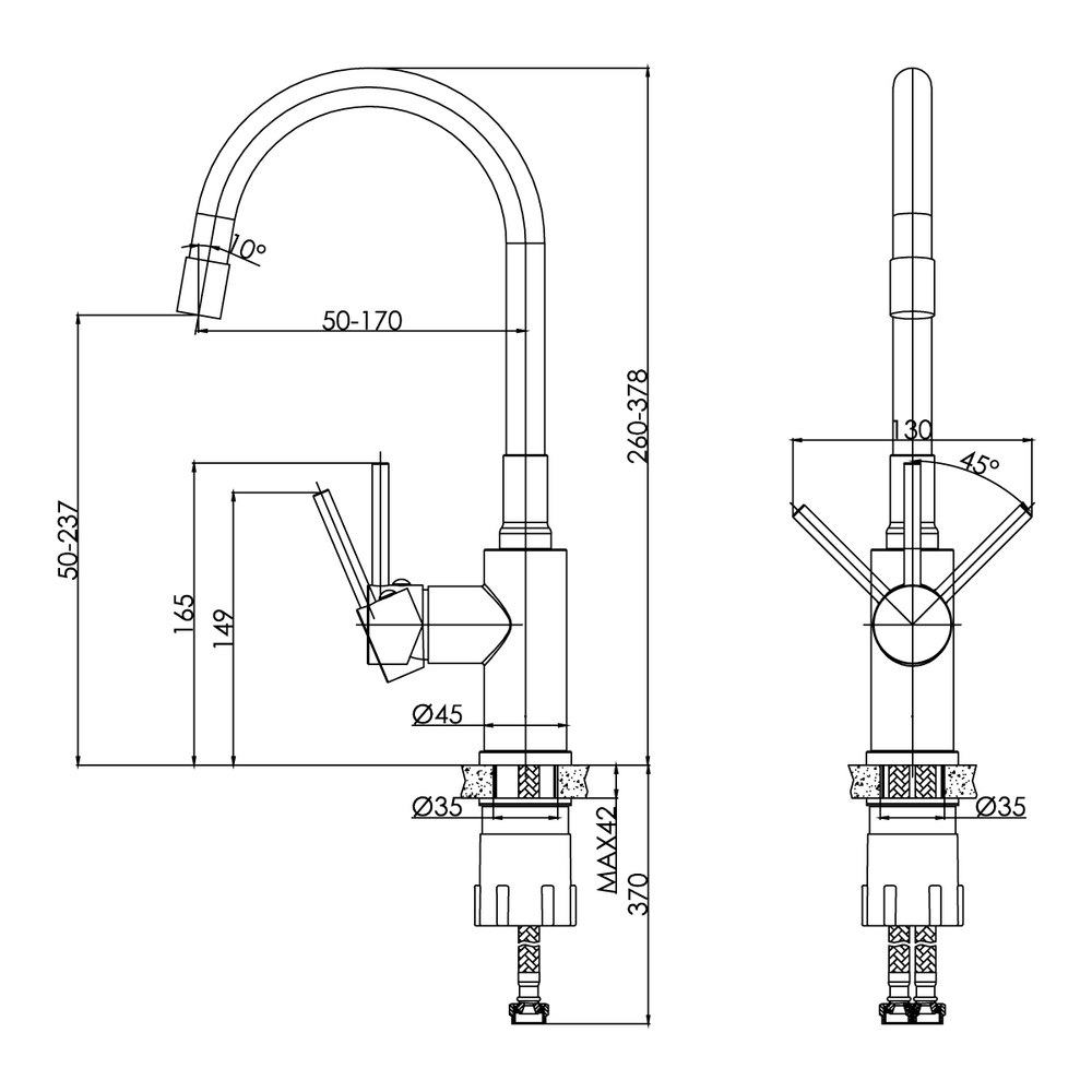 Смеситель для кухни MELAR однорычажный с гибким изливом хром (чертеж)