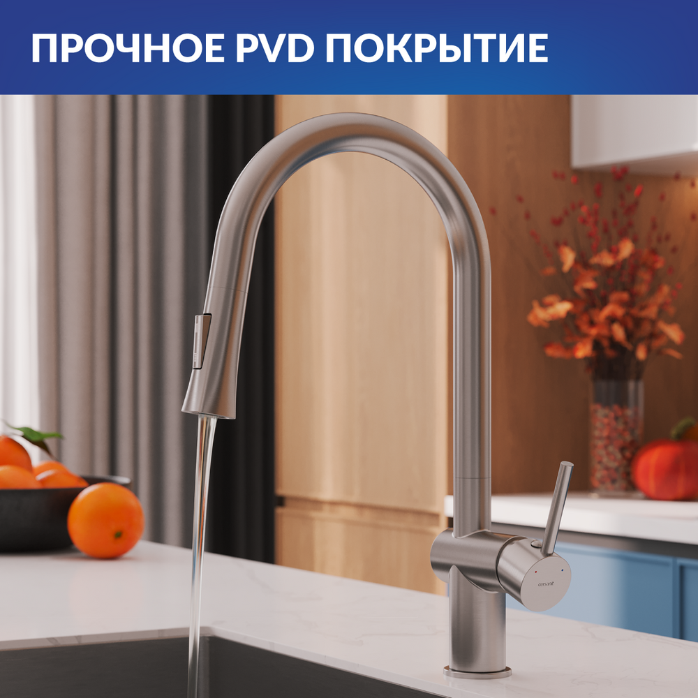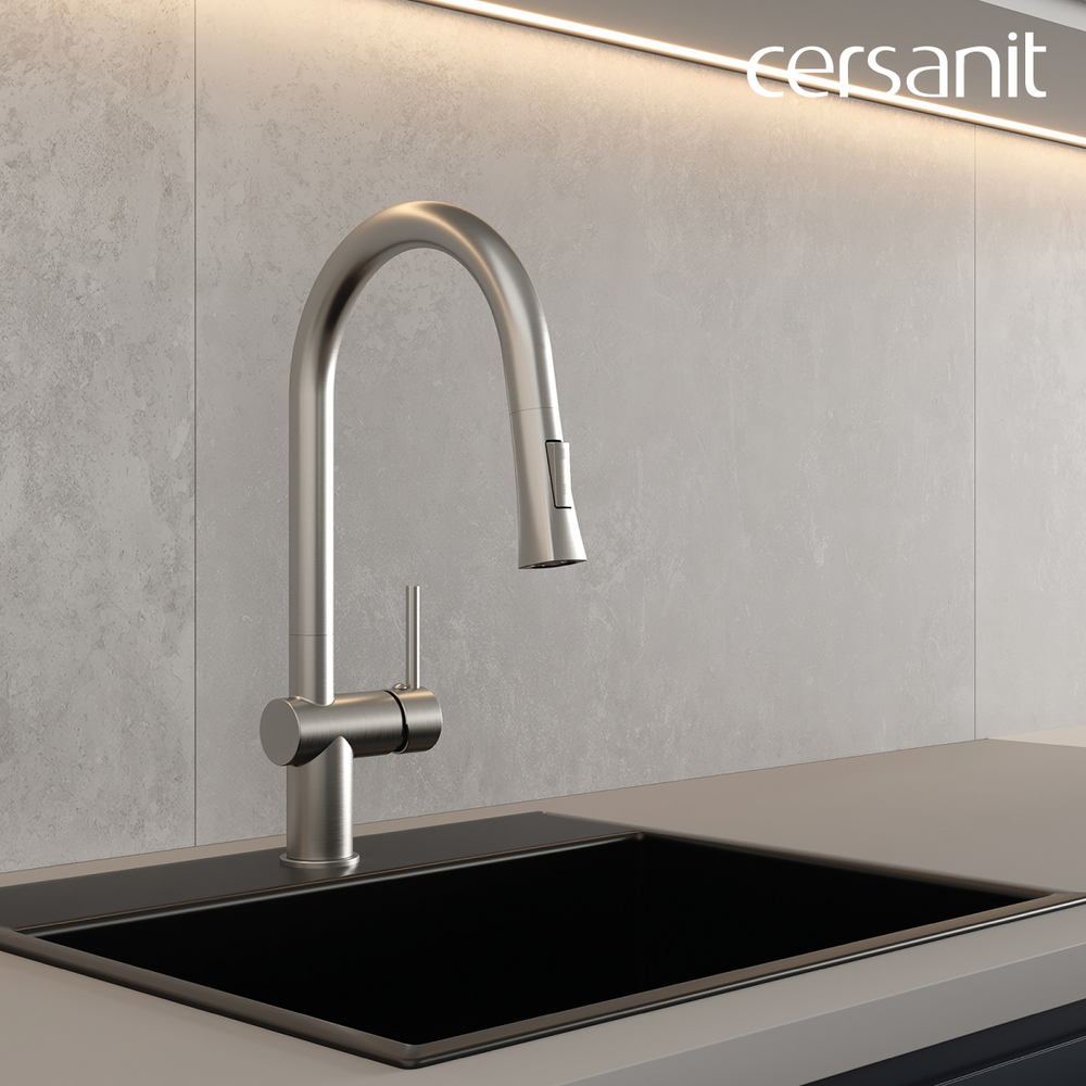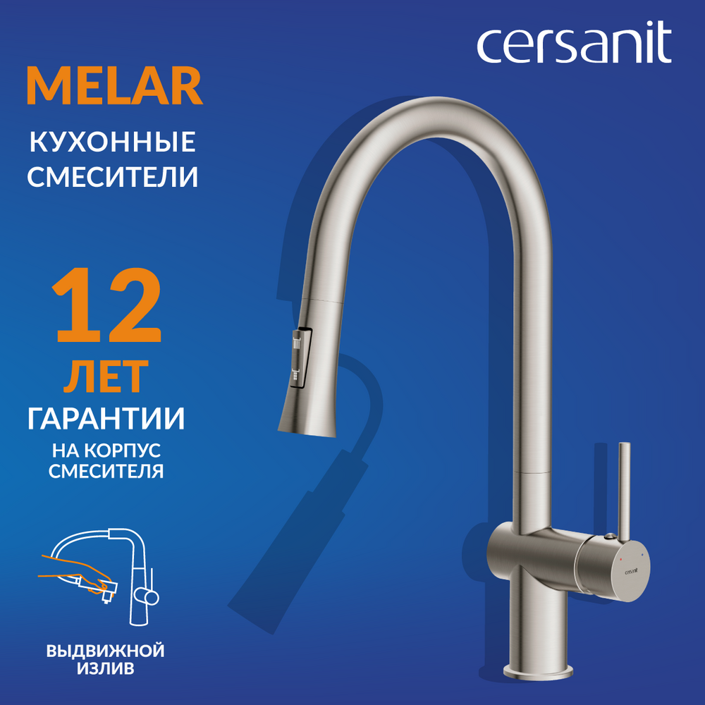 Смесители Melar в классическом дизайне со стильным трапециевидным носиком эффектно дополнят интерьер. Их выдвижной излив подарит свободу движений и поможет сэкономить место на кухне. Стильное оборудование представлено в актуальном сатине. Стойкое покрытие PVD будет радовать красотой долгие годы. За такими смесителями просто ухаживать, для поддержания эстетичного внешнего вида достаточно лишь стирать капли воды после использования.