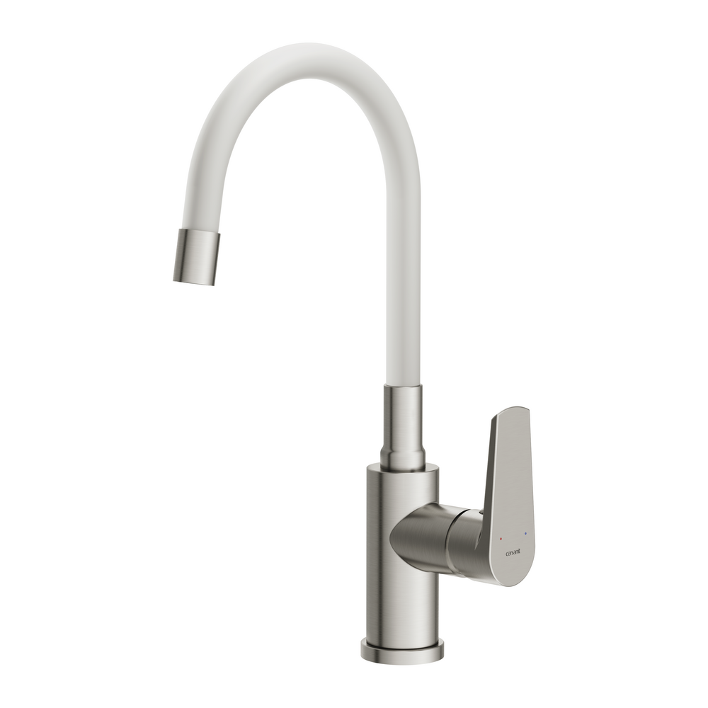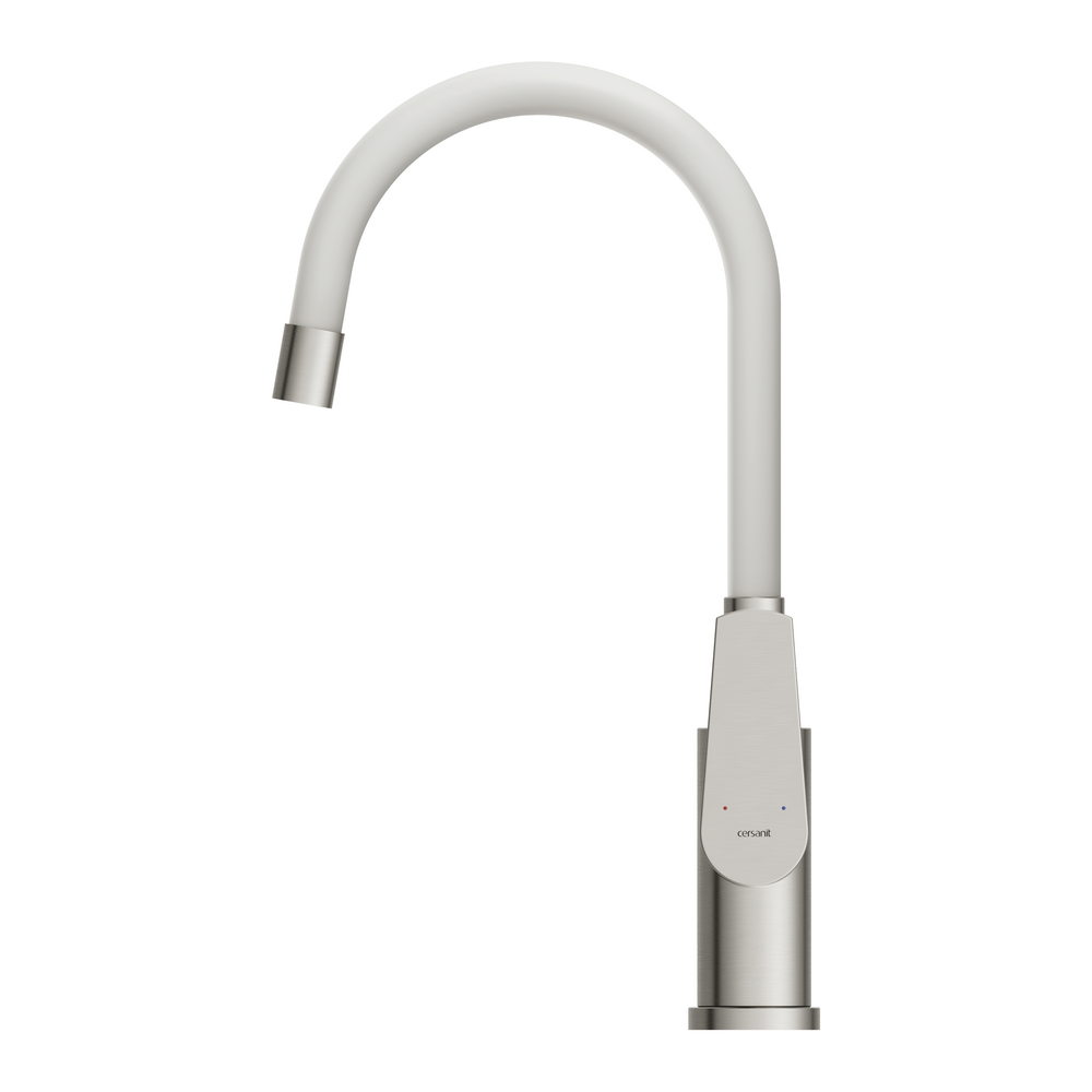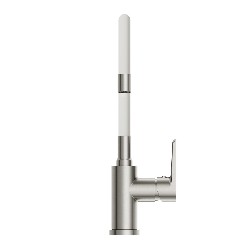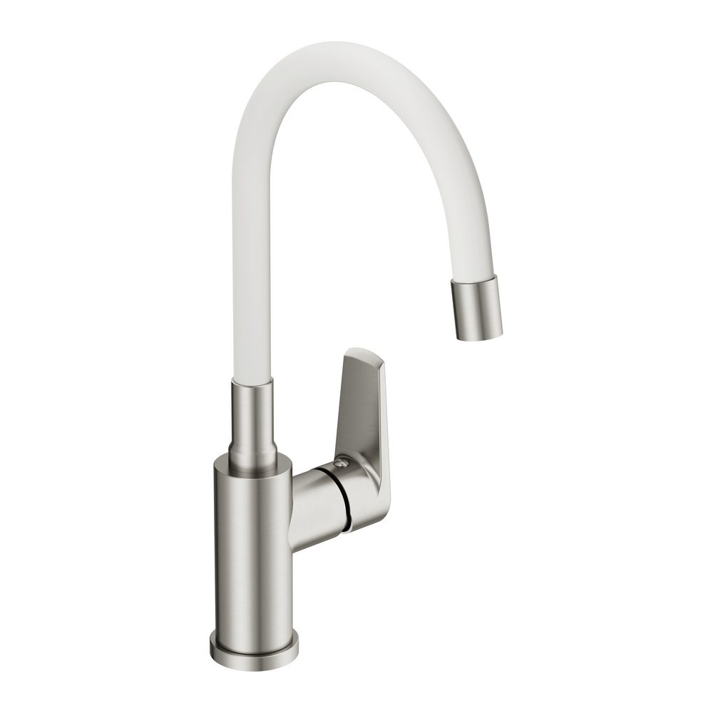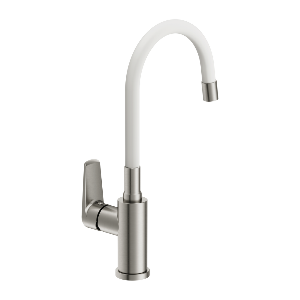 Оборудование представлено в стильной комбинации двух оттенков: это сатиновый корпус и матовый силиконовый излив белого цвета. За такими смесителями просто ухаживать, для поддержания эстетичного внешнего вида достаточно лишь стирать капли воды после использования. За такими смесителями просто ухаживать, для поддержания эстетичного внешнего вида достаточно лишь стирать капли воды после использования.
