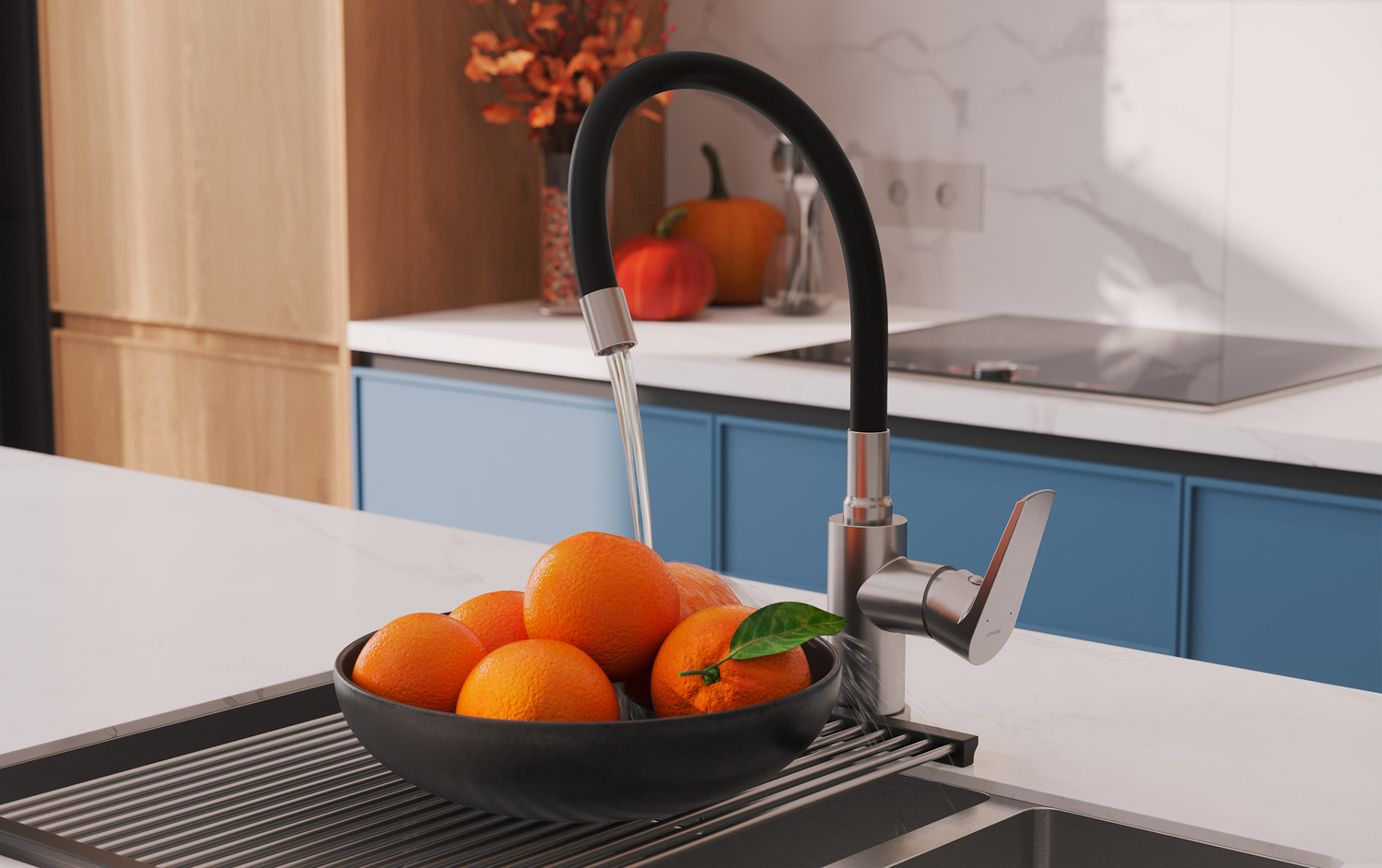 Кухонный смеситель Moduo в трендовом сочетании нескольких цветов с гибким силиконовым изливом добавляет повседневным делам ощутимый комфорт. Оборудование идеально подходит для мытья овощей и фруктов, заполнения больших кастрюль и ухода за раковиной. Термостойкий силиконовый шланг обеспечивает изливу гибкость и долговечность. Даже спустя годы форма смесителя сохранится без деформаций.