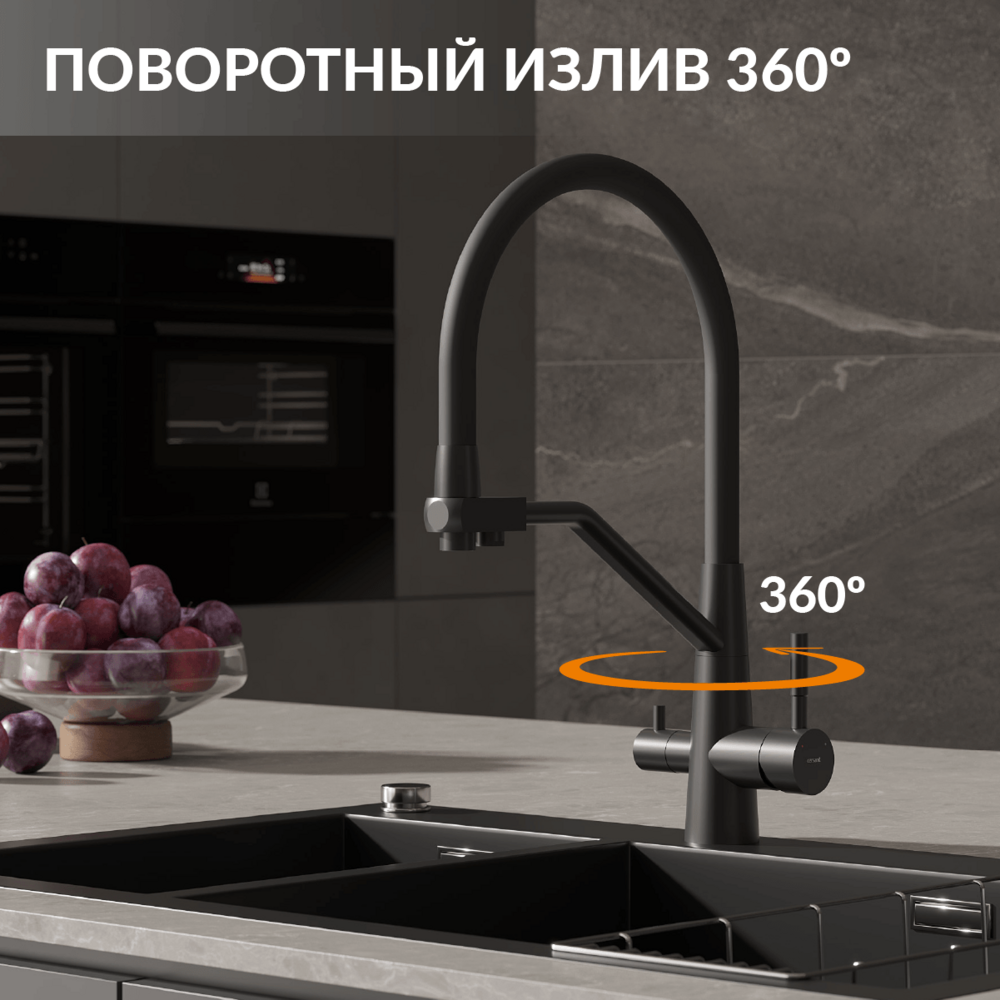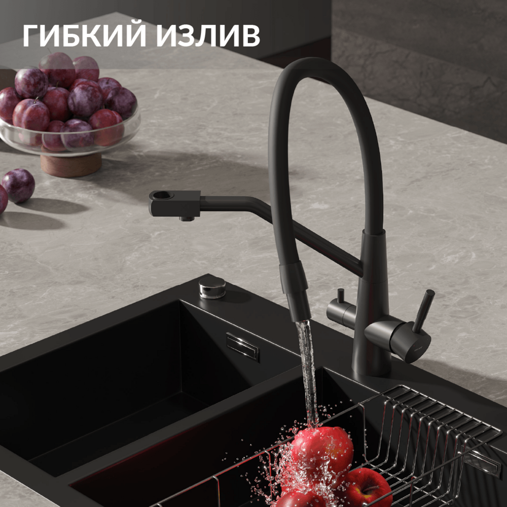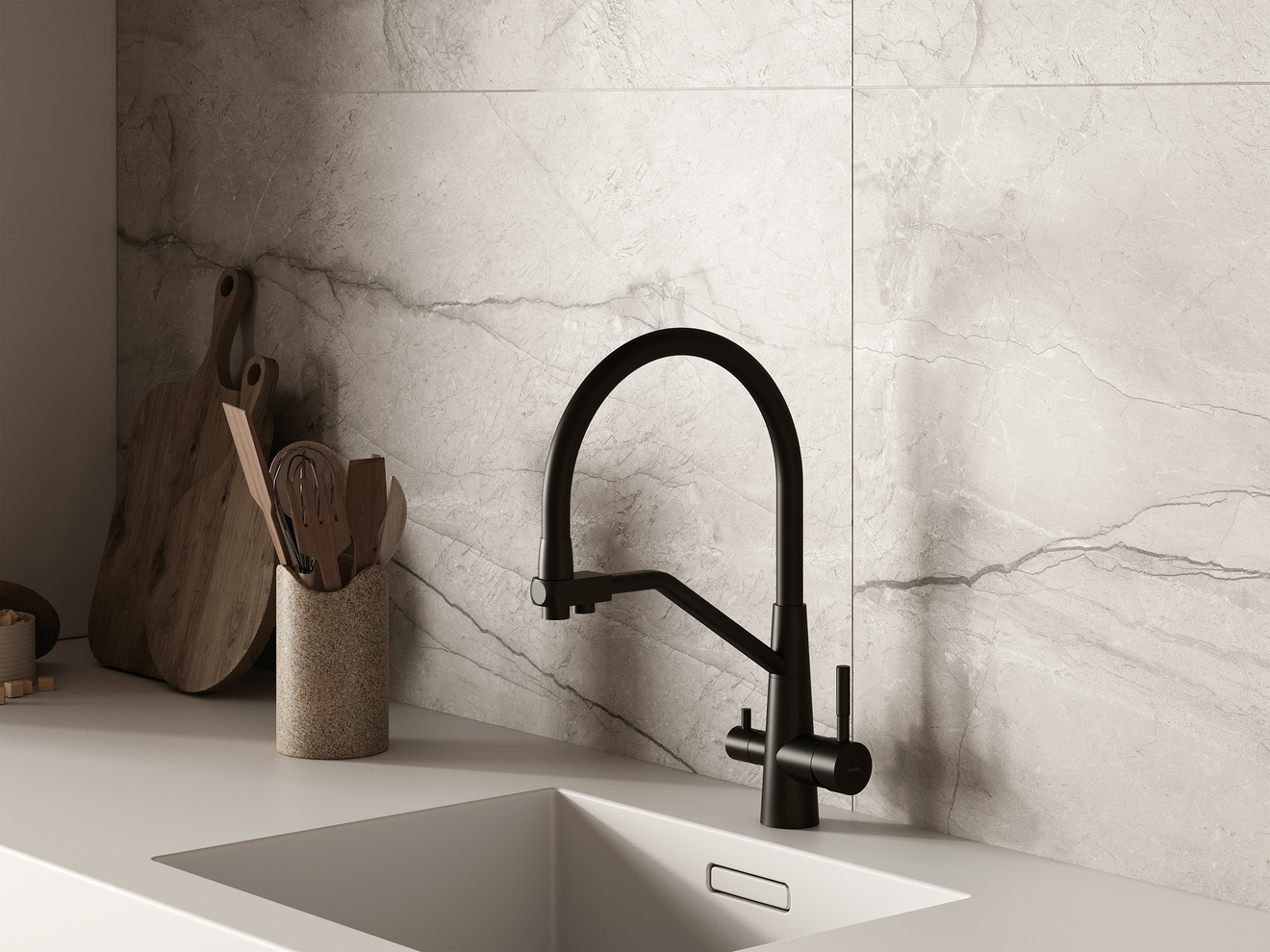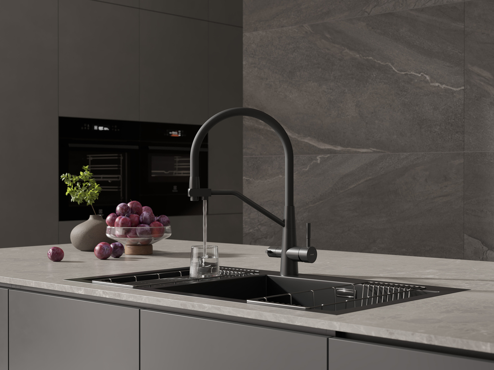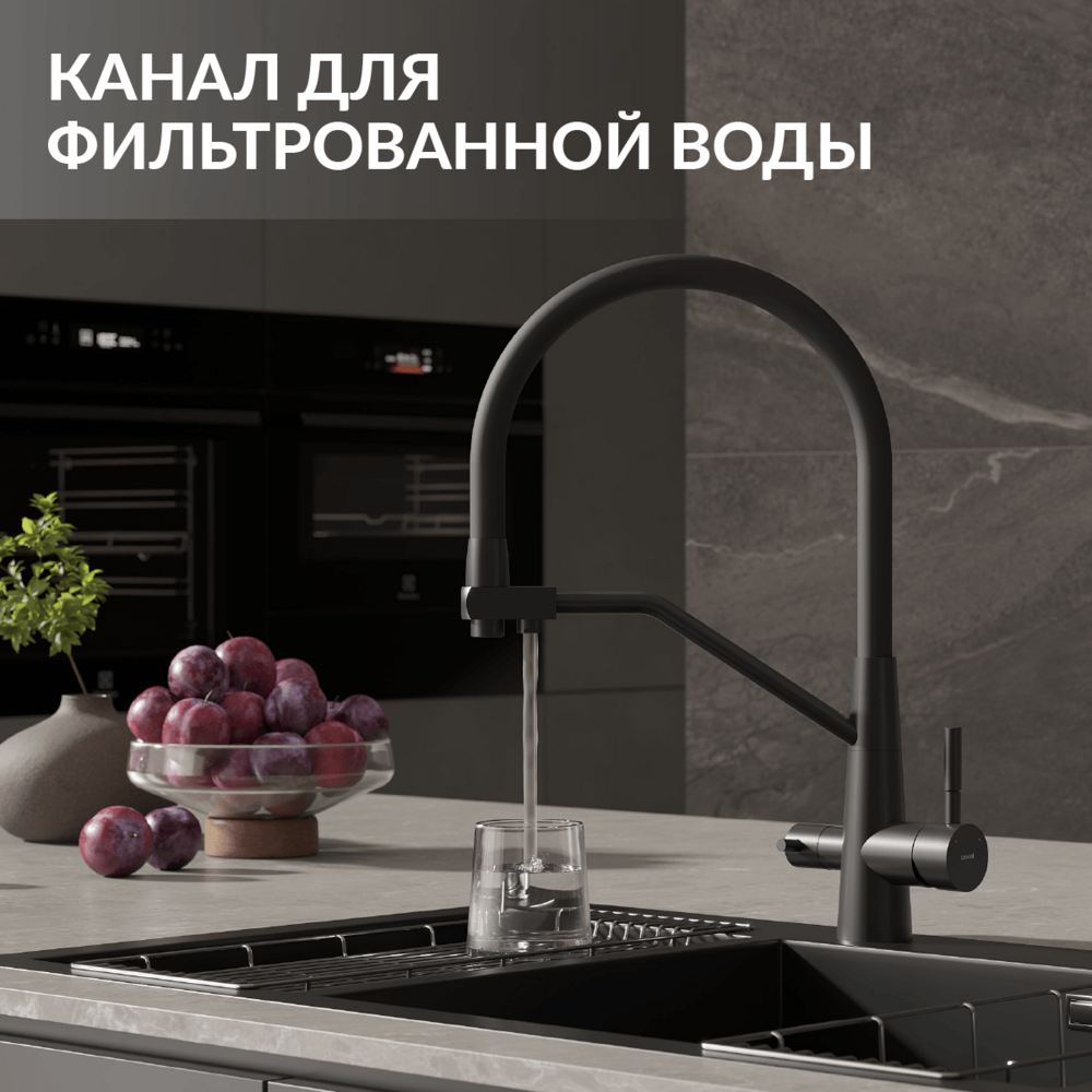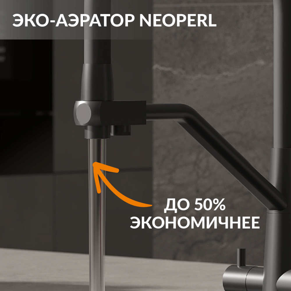 Отдельный излив предусмотрен под фильтрованную воду. Смеситель оснащен системой с двумя ручками. Одна включает проточную воду, а вторая — проточную. Внутри излива расположен аэратор Neoperl. Это решение позволяет объединить разные функции в одном смесителе, избавившись от визуального шума на кухне.