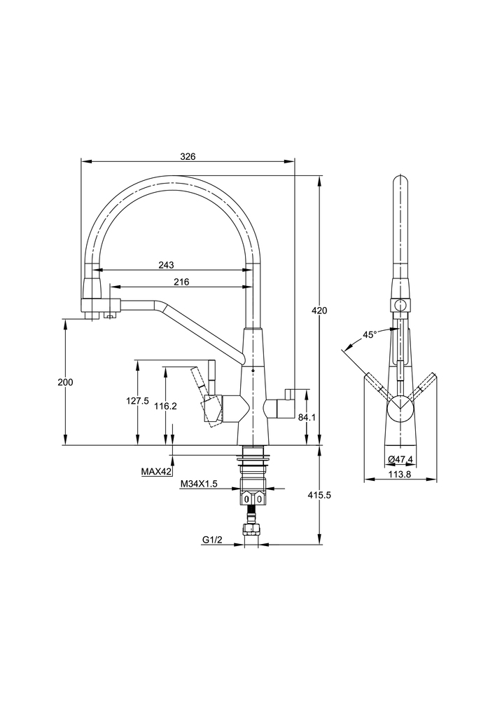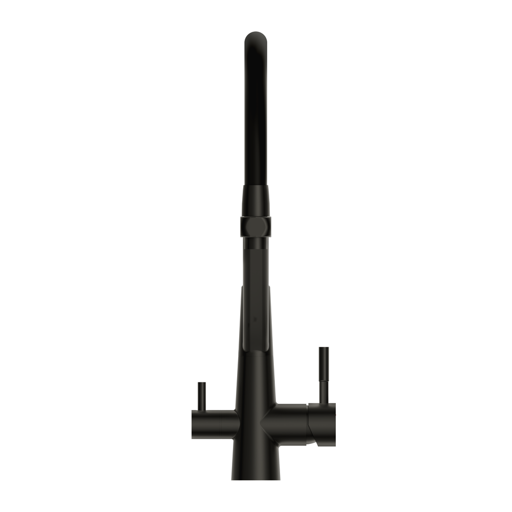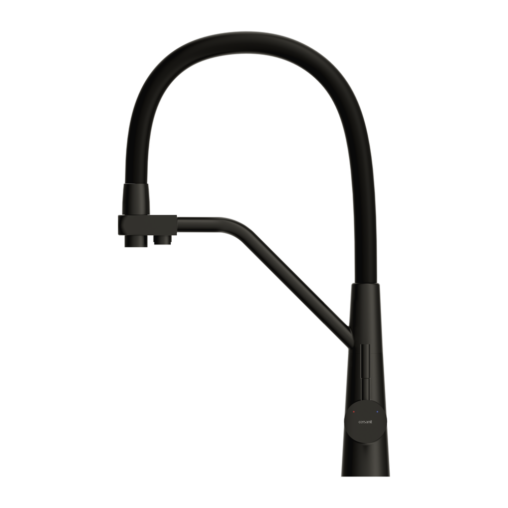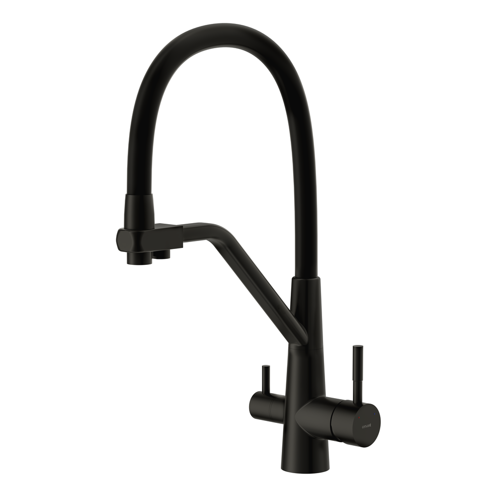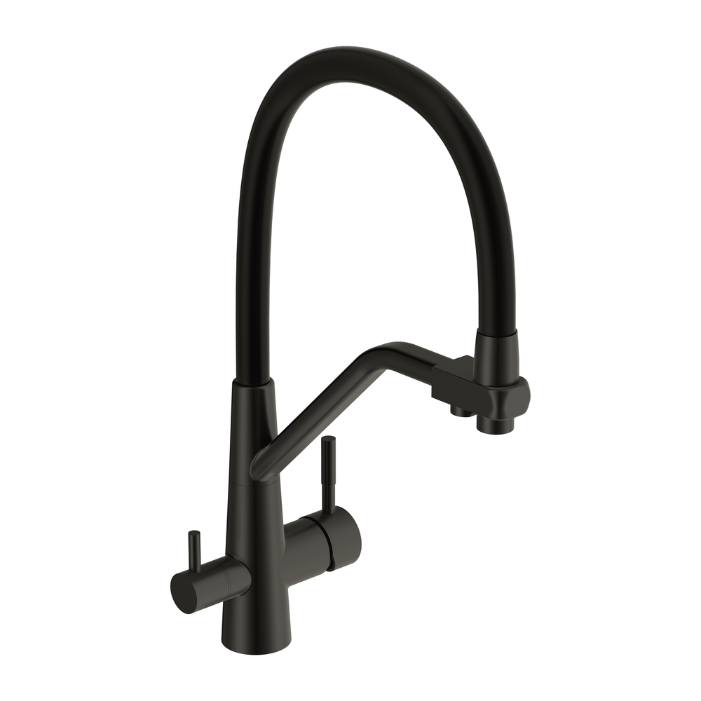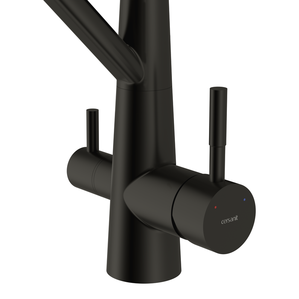 Отдельный излив предусмотрен под фильтрованную воду. Смеситель оснащен системой с двумя ручками. Одна включает проточную воду, а вторая — проточную. Внутри излива расположен аэратор Neoperl. Это решение позволяет объединить разные функции в одном смесителе, избавившись от визуального шума на кухне.