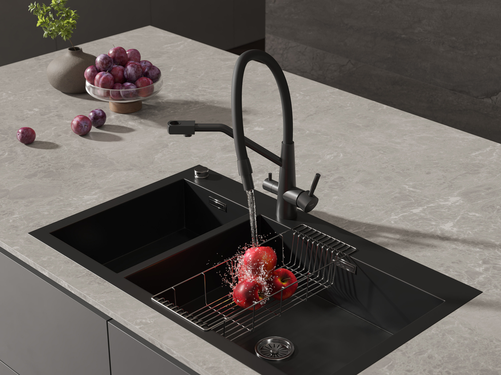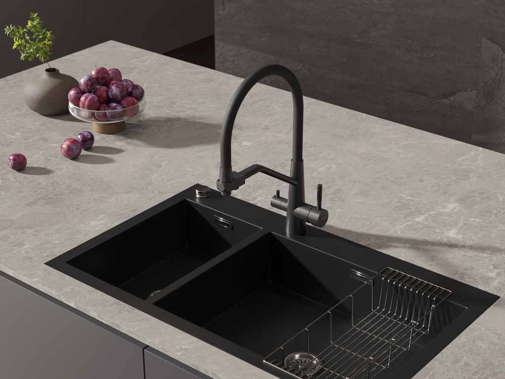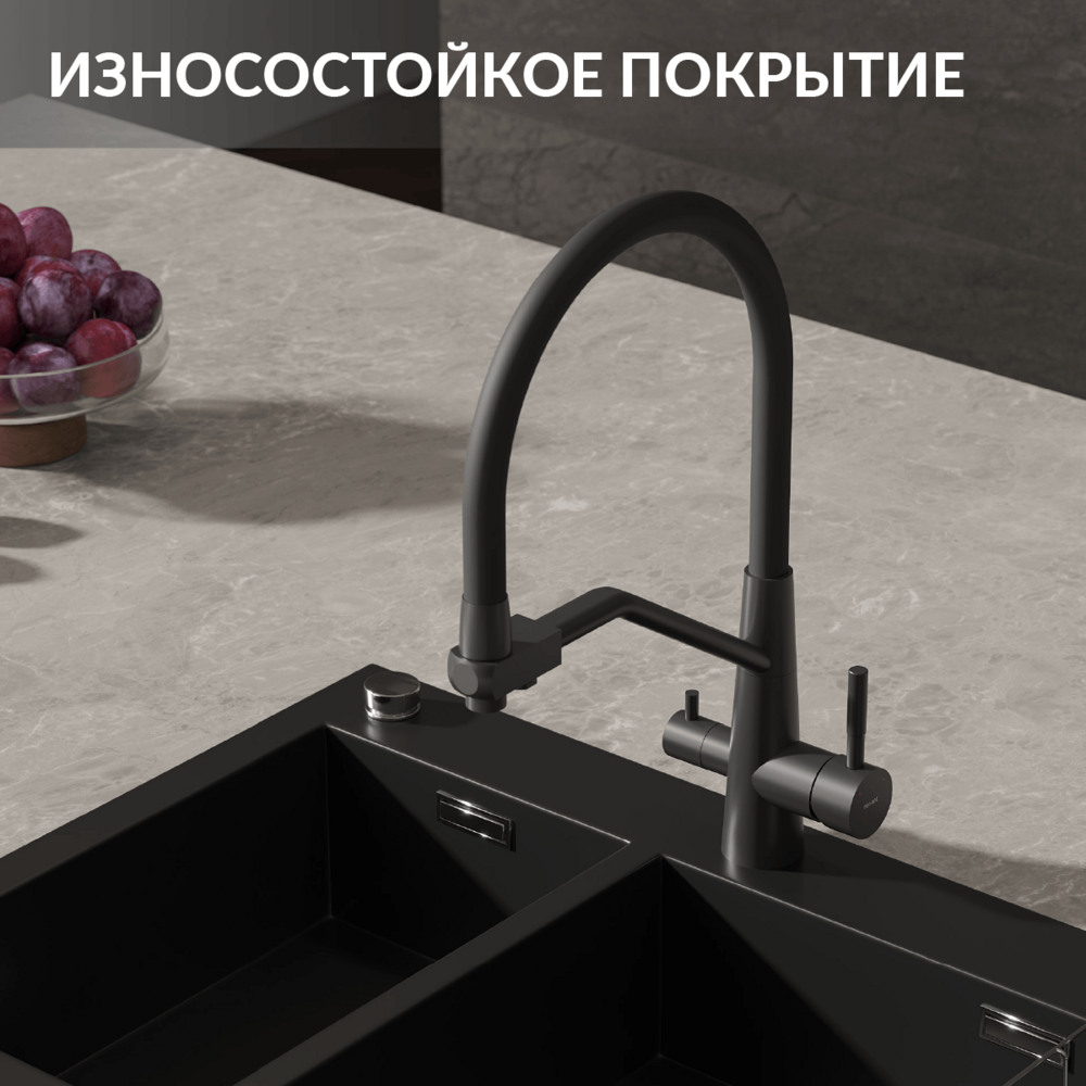 Стильное контрастное оборудование представлено в актуальном чёрном цвете. Матовое покрытие смесителя, нанесённое методом электрофореза, надежно защищает от влаги и подчёркивает строгость дизайна. Эта поверхность не деформируется и не теряет эстетических качеств под воздействием воды и солей. Такой смеситель более долговечен и надолго сохранит свой первоначальный внешний вид.