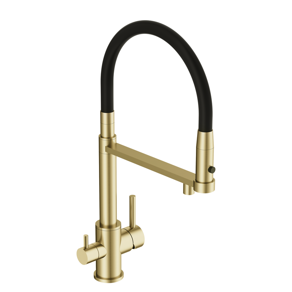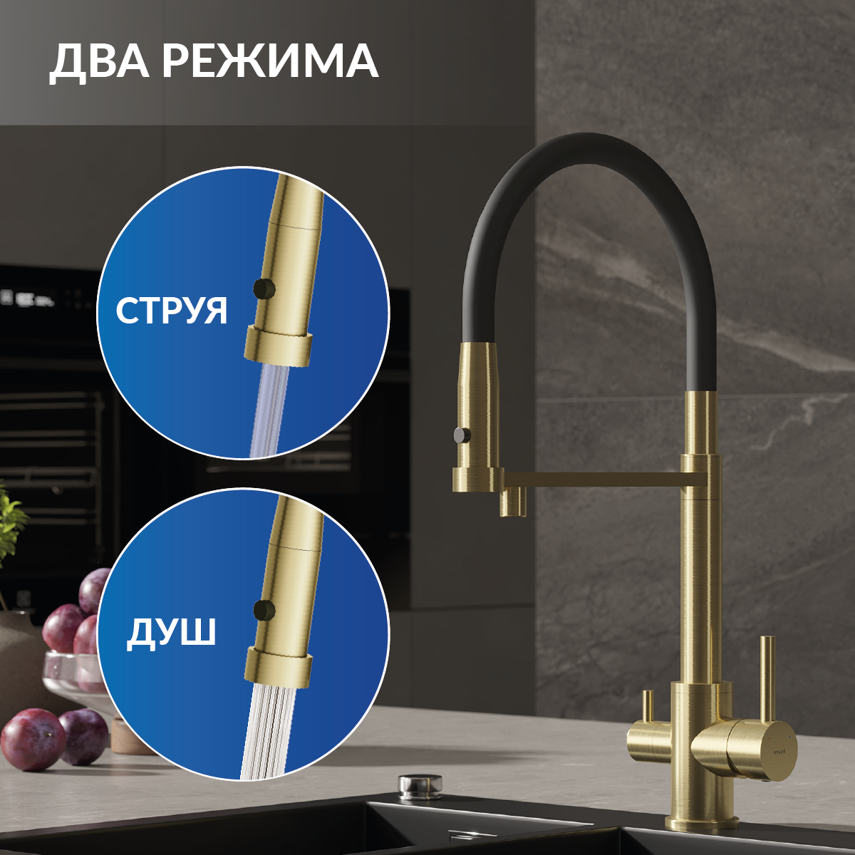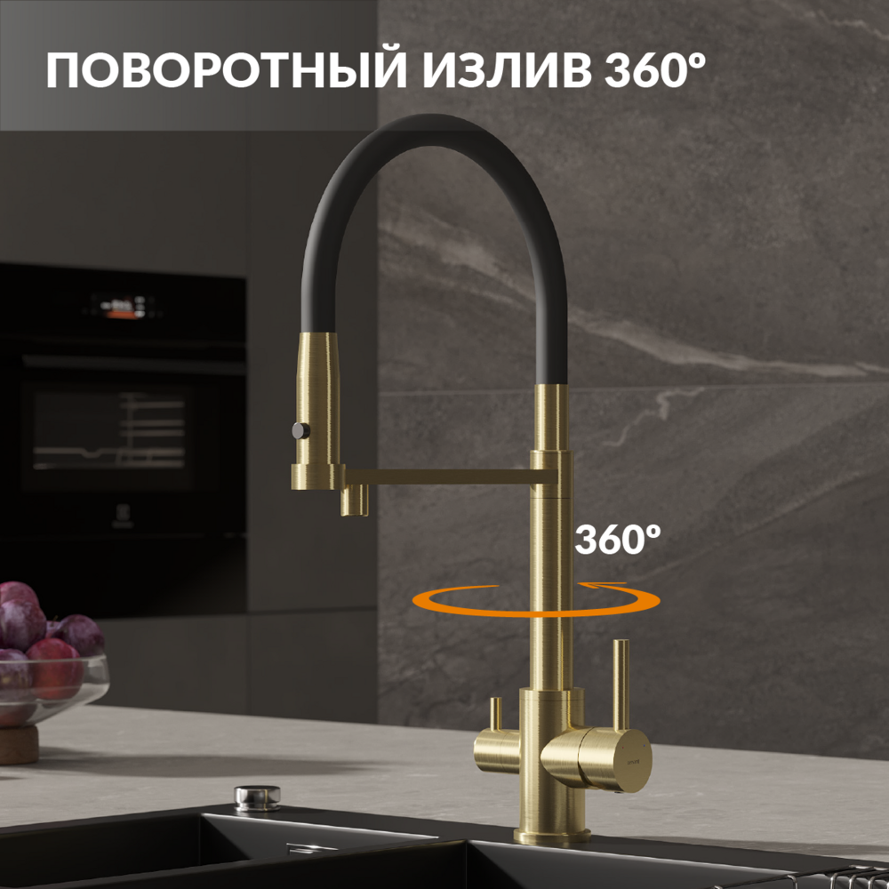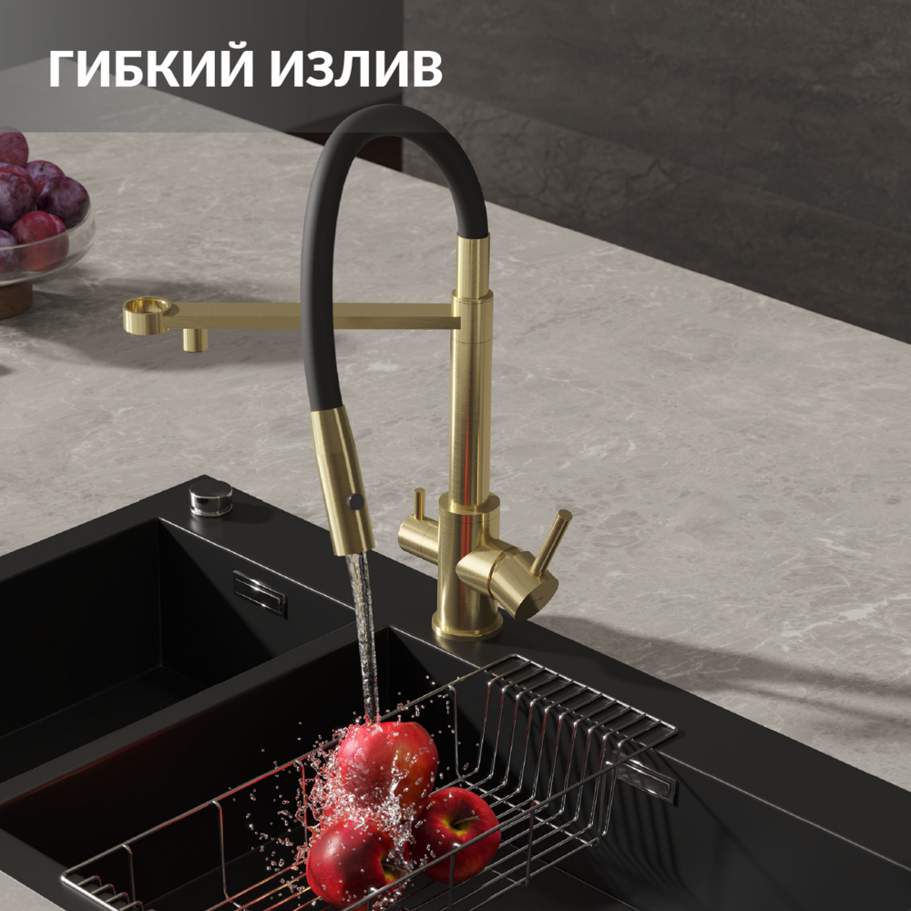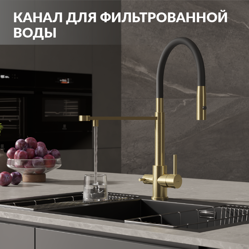 Модель с футуристичным и нетривиальным дизайном станет украшением кухни. Стойкое золотое PVD-покрытие будет радовать красотой долгие годы. За такими смесителями просто ухаживать, для поддержания эстетичного внешнего вида достаточно лишь стирать капли воды после использования.