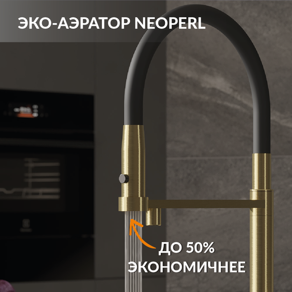 Смеситель оснащен гибким изливом из термостойкого силикона. Материал нетоксичен, а потому безопасен для использования на кухне. Выполненный из качественных материалов, он обладает повышенной износостойкостью и устойчивостью к перегибам. С таким решением у хозяек становится больше свободы движения, а значит, и больше комфорта каждый день! Аэратор Neoperl формирует стабильно ровный поток воды даже при плохом напоре. Он позволяет экономить до 50% воды по сравнению с обычными смесителями.