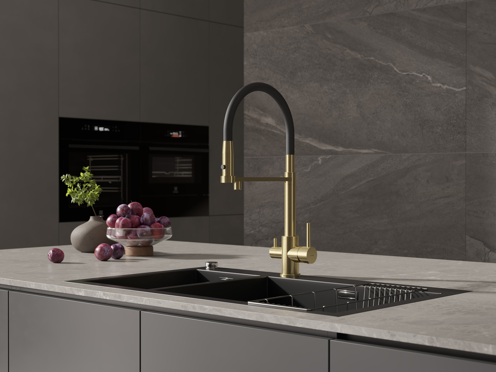Стильный и современный смеситель Zen станет вашей технологичной находкой. Корпус, изготовленный из надежной и долговечной латуни, защищен от гидроударов. Гибкий излив и отдельный канал для фильтрованной воды, а также ручка, позволяющая установить смеситель вплотную к стене, эффективно экономят пространство на кухне.