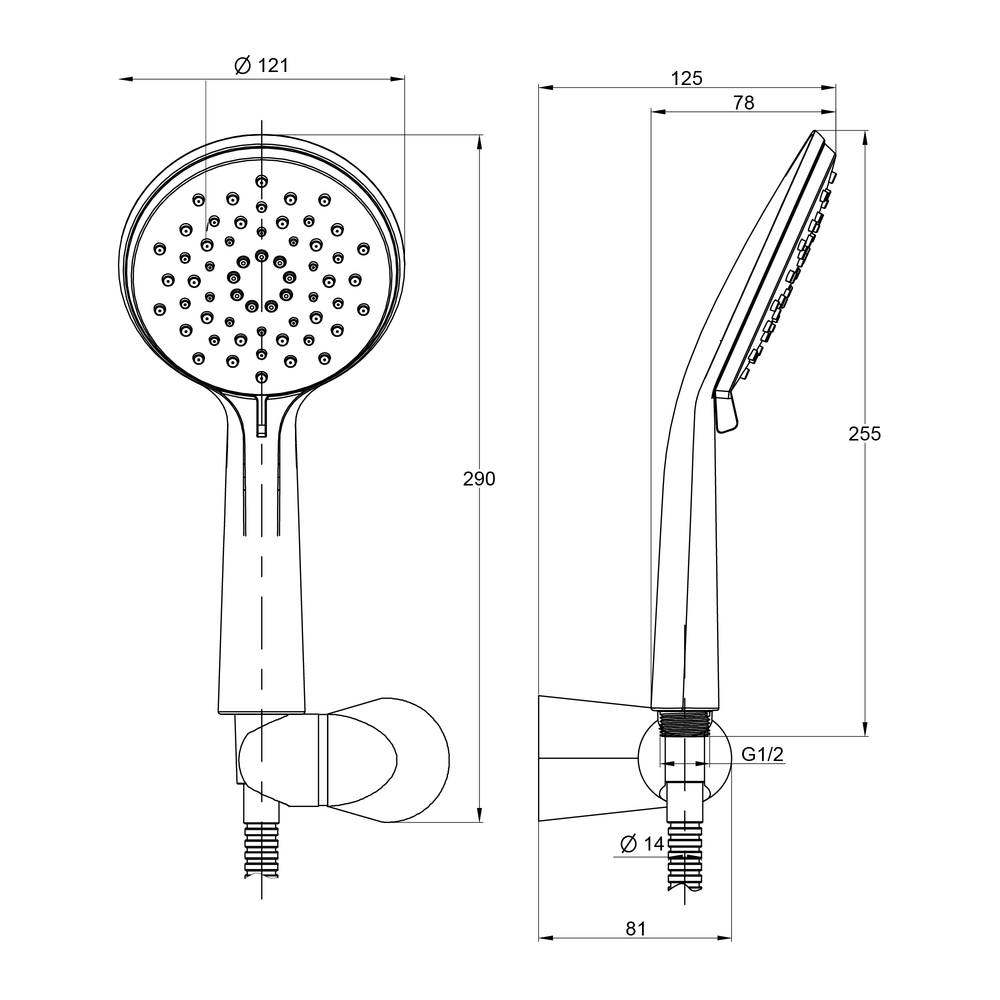 Душевой гарнитур LARA (держатель лейки) 3 режима шланг 180 металл круг черный (чертеж)