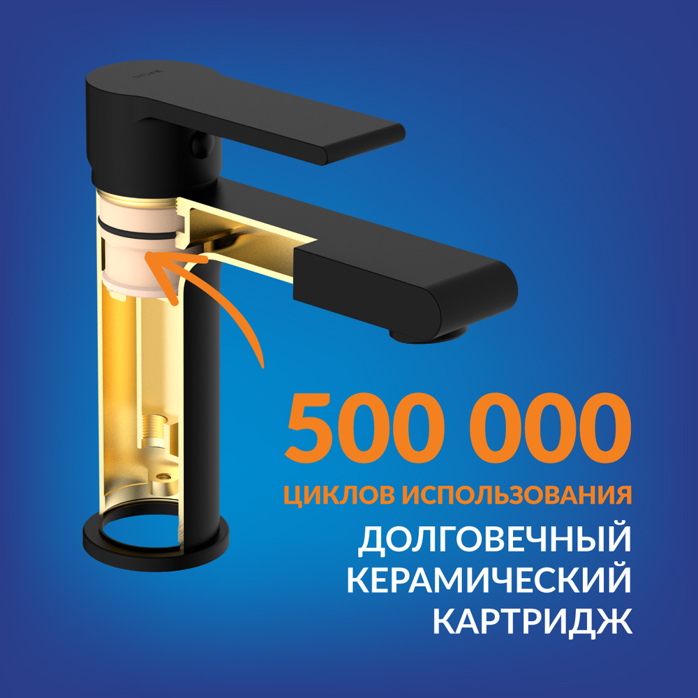 Внутри изделия установлен керамический картридж 35 мм, рассчитанный на 500 тыс. циклов использования. Он будет точно смешивать воду все 5 лет по гарантии и даже дольше.
