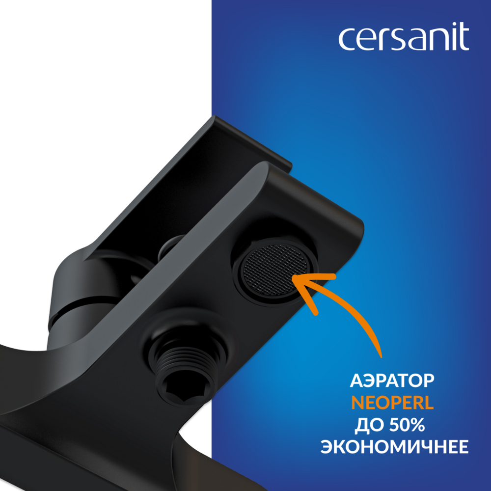 Смеситель оборудован аэратором Neoperl, который позволяет экономить воду. Аэратор перемешивает воду с воздухом и рассеивает струю, подавая воду без брызг.