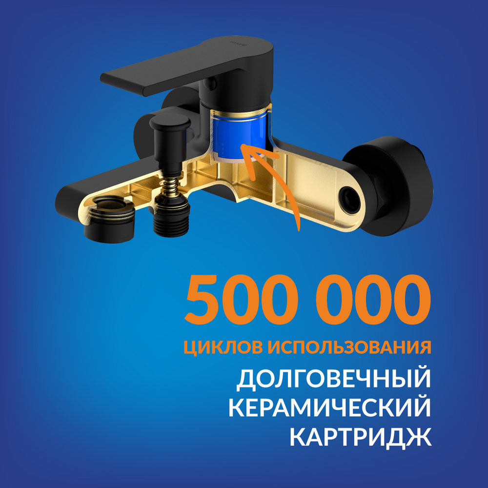Качественный керамический картридж с гарантией 5 лет обеспечивает плавный ход ручки и абсолютную точность регулировки температуры и напора воды. Он рассчитан на 500 тыс. циклов использования, чего хватает на долгие годы.
