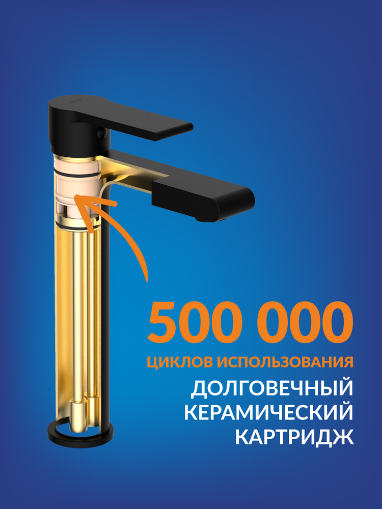 Оборудование оснащено керамическим картриджем, рассчитанным на 500 тыс. циклов использования и защищённым гарантией производителя на 5 лет. Благодаря ему вода точно смешивается даже при плохом напоре.
