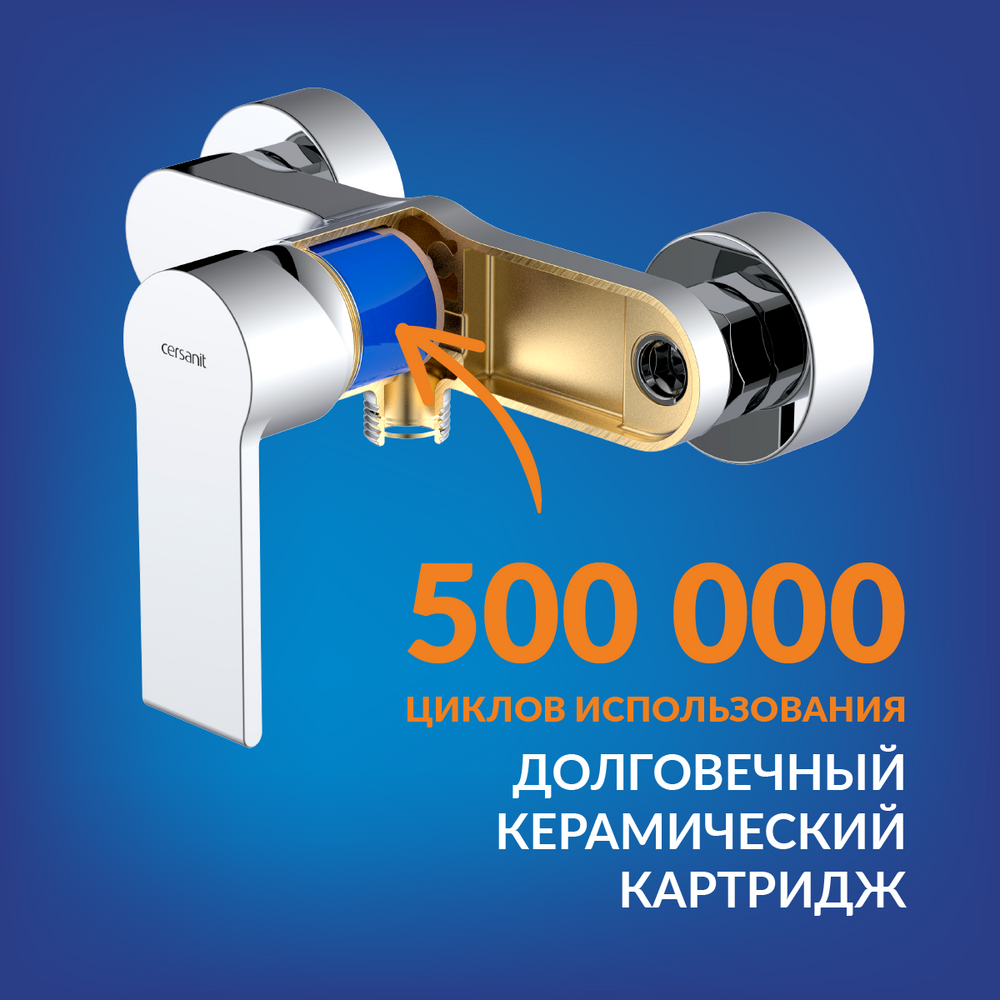 Плавный ход ручки смесителя обеспечивает качественный керамический картридж, рассчитанный на 500 тыс. циклов открытия и закрытия. За счёт мягкой и точной регулировки воды даже со слабым напором водные процедуры становятся комфортными. Cersanit даёт гарантию на картридж смесителя 5 лет.