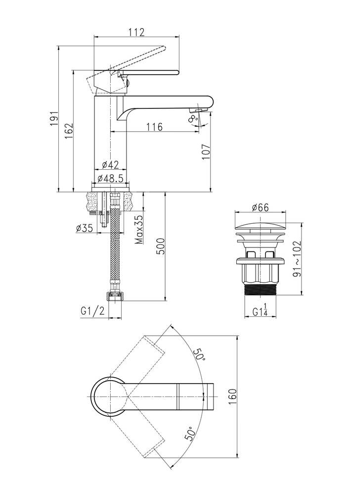 смеситель, подводка для воды, донный клапан (PVC), крепеж, гарантийный талон, инструкция по эксплуатации