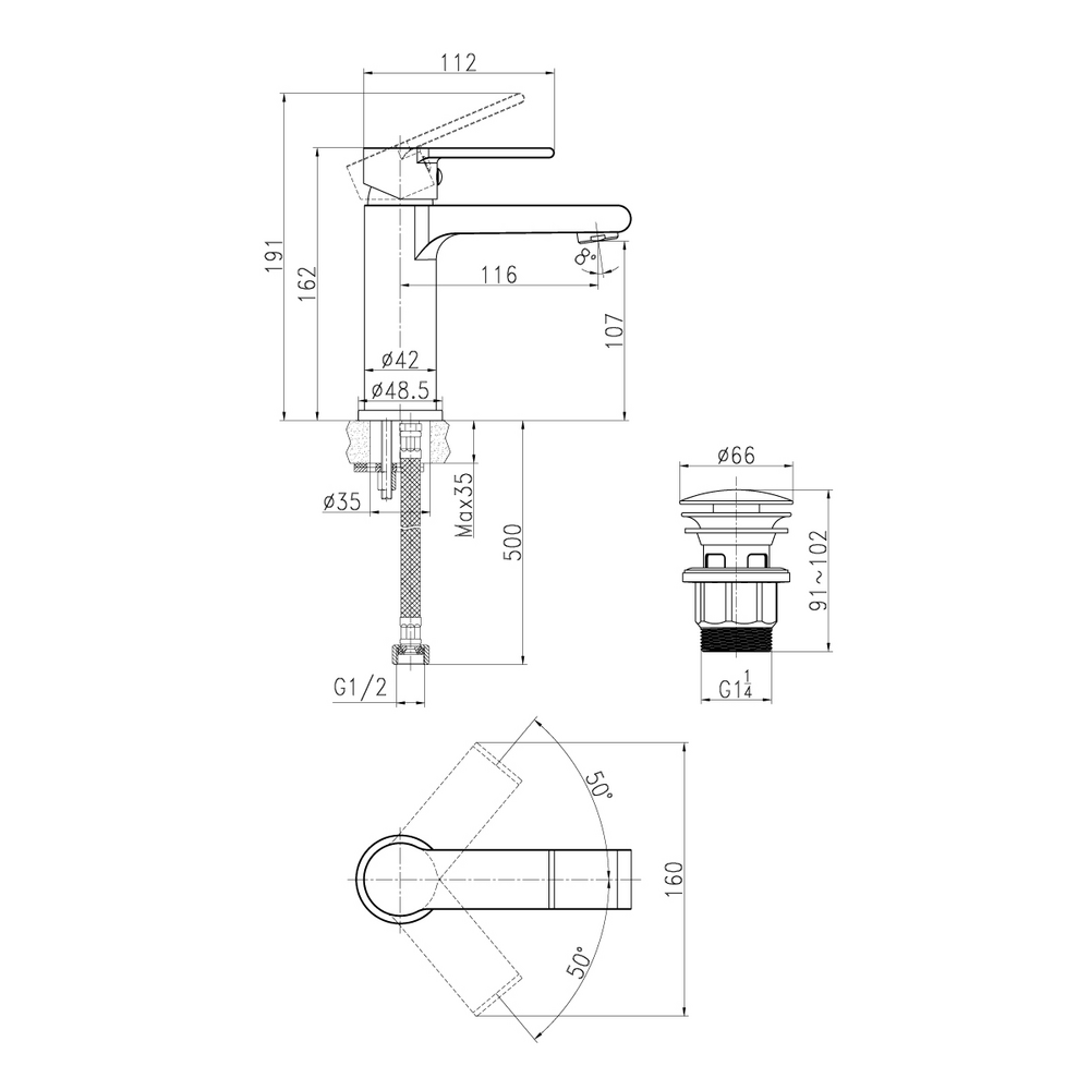 смеситель, подводка для воды, донный клапан (PVC), крепеж, гарантийный талон, инструкция по эксплуатации
