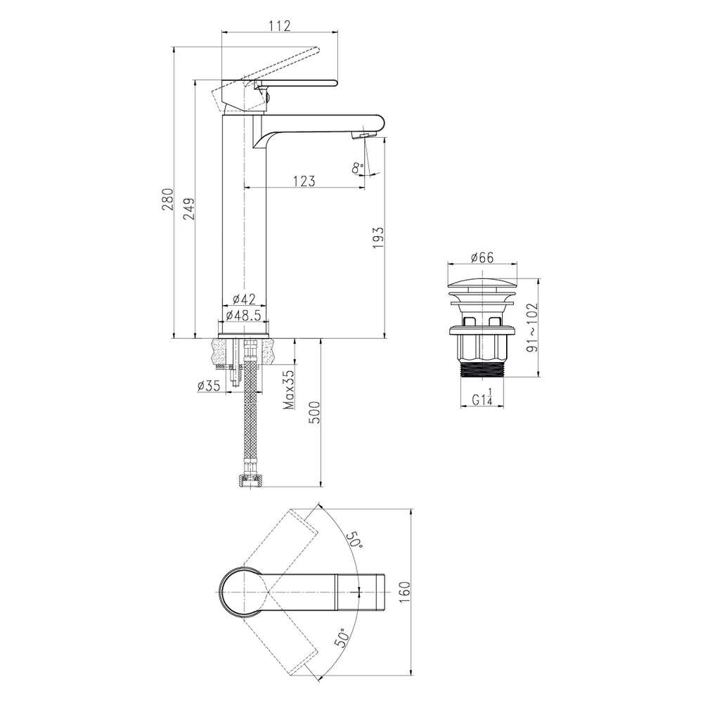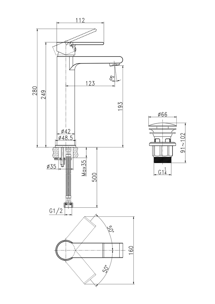 смеситель, подводка для воды, донный клапан (PVC), крепеж, гарантийный талон, инструкция по эксплуатации