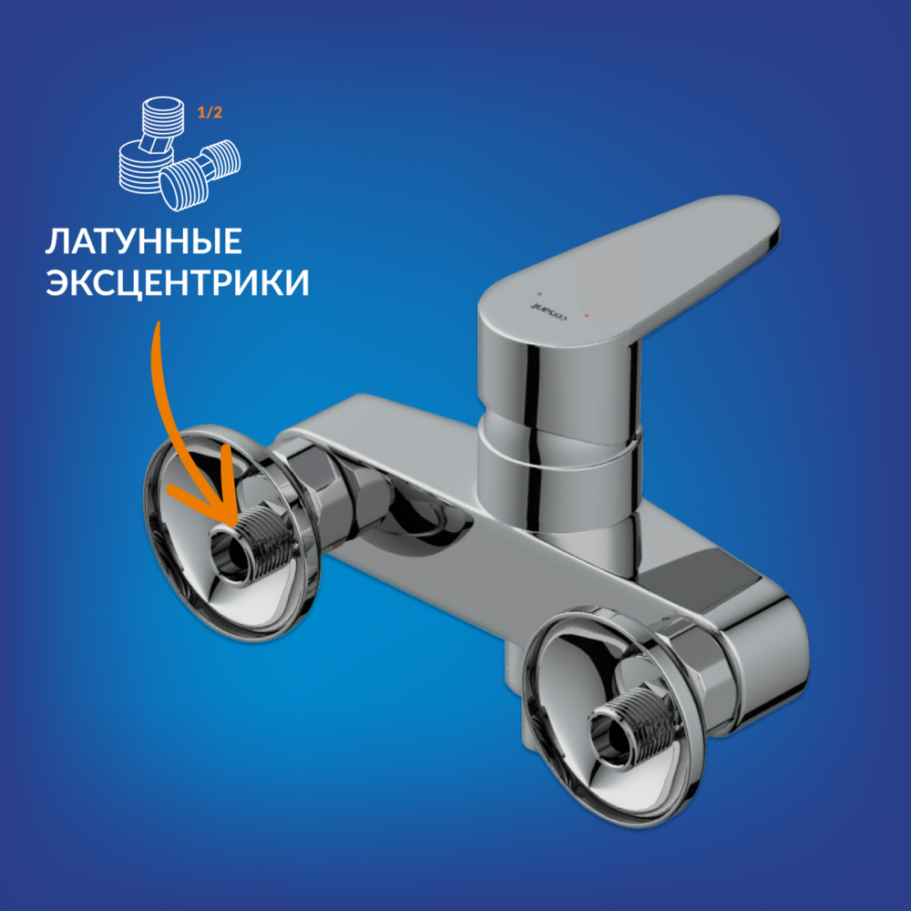 смеситель, декоративные накладки, S-образные эксцентрики, душевая лейка, шланг, держатель лейки, гарантийный талон, инструкция по эксплуатации