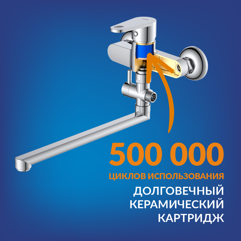 Плавный ход ручки и абсолютная точность регулировки температуры и напора воды обеспечиваются за счет качественного керамического картриджа. Он рассчитан на 500 тыс. циклов открытия и закрытия и защищен гарантией сроком на 5 лет.