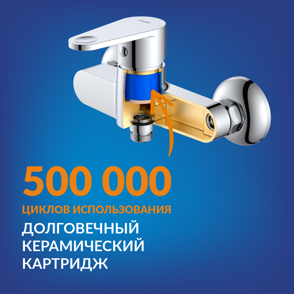 Внутри смесителя уставлен керамический картридж, рассчитанный на 500 тыс. циклов использования. Благодаря ему даже при плохом напоре происходит точное смешивание воды. Гарантия на картридж — 5 лет.