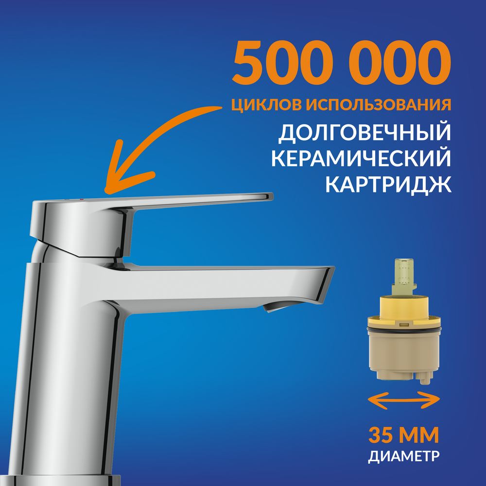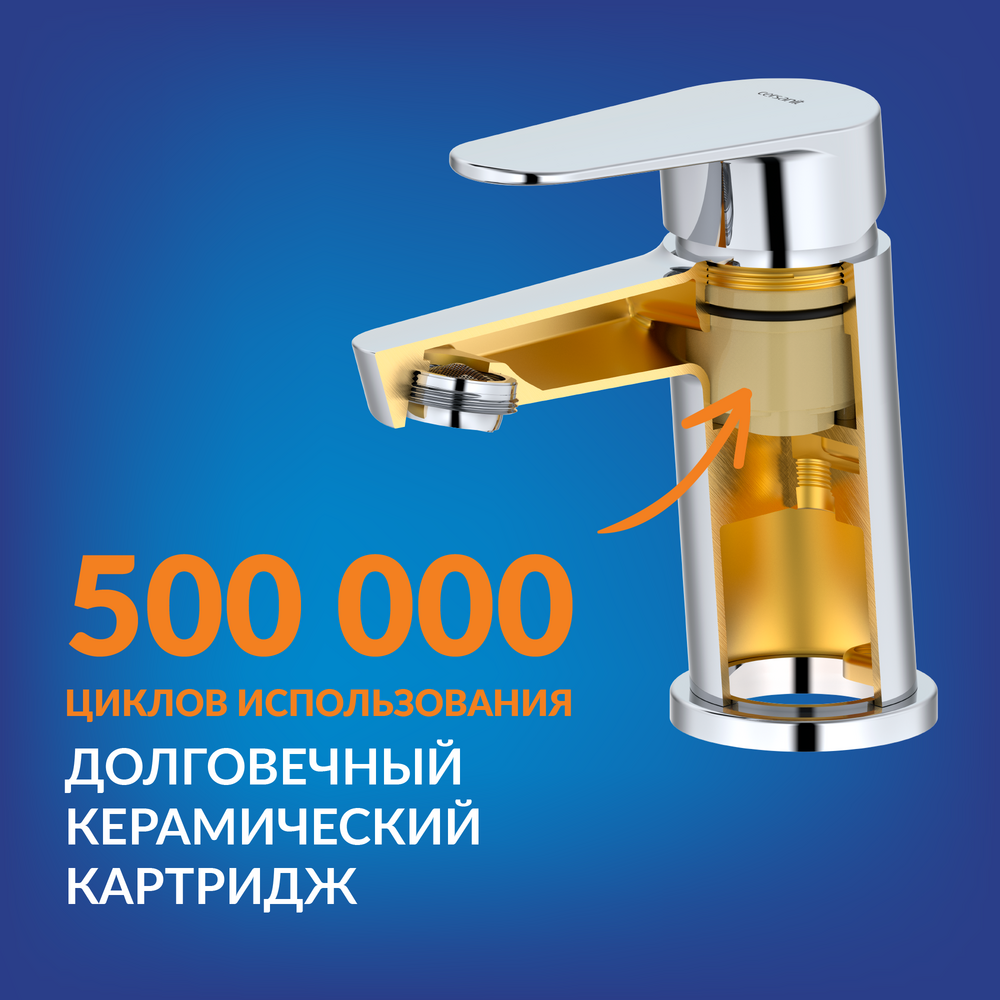Надёжный керамический картридж обеспечивает более долгий срок службы смесителя, независимо от жёсткости воды. Он рассчитан на 500 000 циклов открытия-закрытия — это до 30 лет бесперебойной работы в семье из 4 человек.