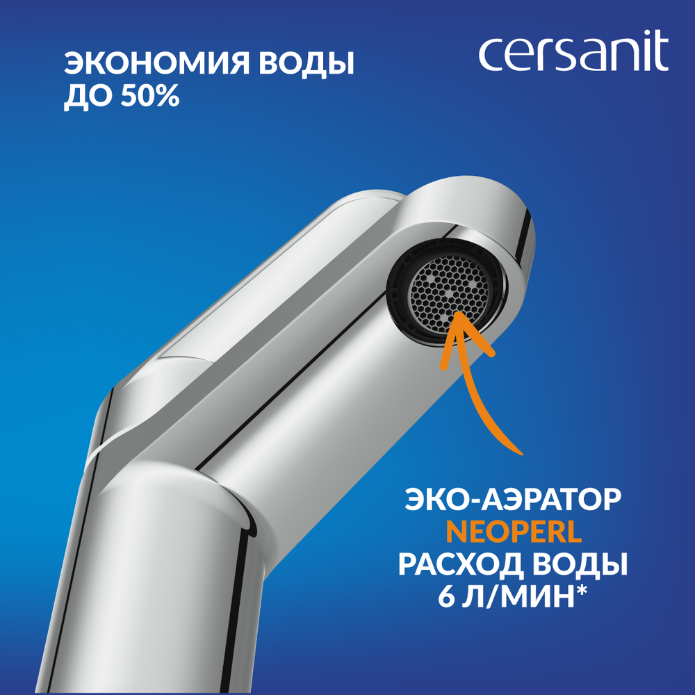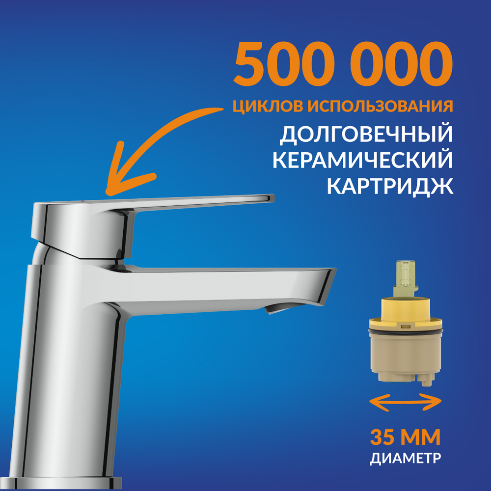 Надёжный керамический картридж обеспечивает более долгий срок службы смесителя, независимо от жёсткости воды. Он рассчитан на 500 000 циклов открытия-закрытия — это до 30 лет бесперебойной работы в семье из 4 человек.