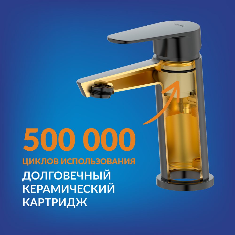 Надёжный керамический картридж обеспечивает более долгий срок службы смесителя, независимо от жёсткости воды. Он рассчитан на 500 000 циклов открытия-закрытия — это до 30 лет бесперебойной работы в семье из 4 человек.