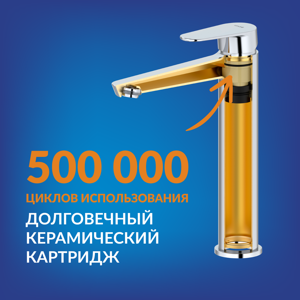 Надёжный керамический картридж обеспечивает более долгий срок службы смесителя, независимо от жёсткости воды. Он рассчитан на 500 000 циклов открытия-закрытия — это до 30 лет бесперебойной работы в семье из 4 человек.