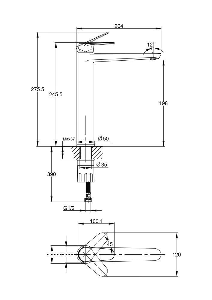 Смеситель для раковины высокий LARA однорычажный хром (чертеж)