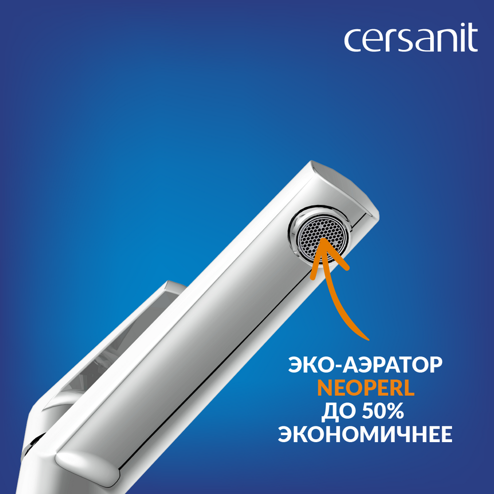 • Аэратор Neoperl пропускает 6 л/мин, позволяет экономить до 50% воды по сравнению с обычными смесители. Его конструкция с защитой от известковых отложений обеспечивает ровный поток без брызг.