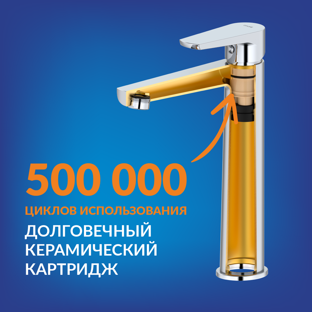 • Керамический картридж диаметром 35 мм выдерживает 500 000 циклов использования. Для семьи из четырех человек это 20 лет надёжной работы.