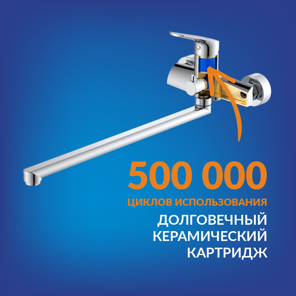 Качественный керамический картридж с гарантией 5 лет обеспечивает плавный ход ручки и абсолютную точность регулировки температуры и напора воды. Он рассчитан на 500 тыс. циклов открытия и закрытия, чего хватает на долгие годы.