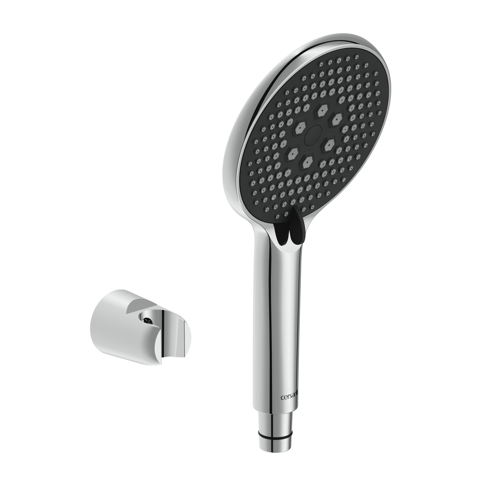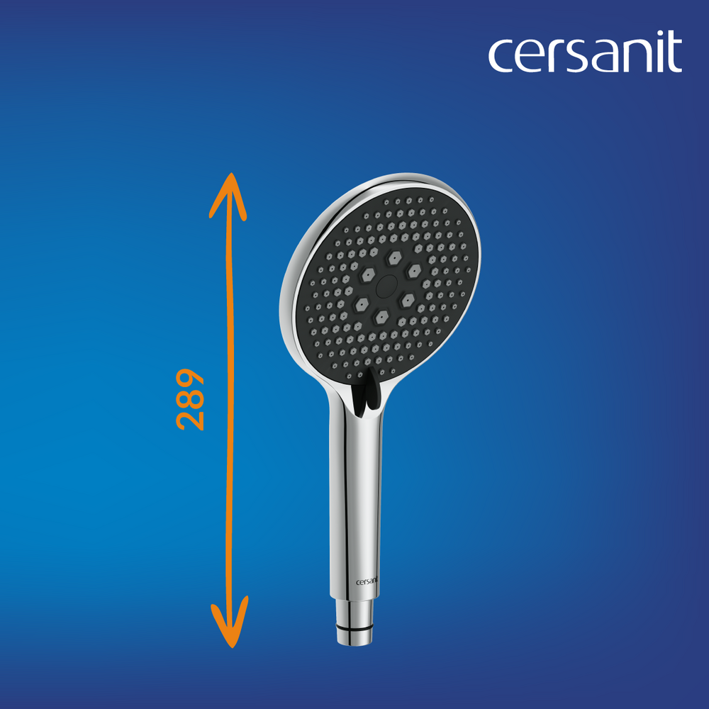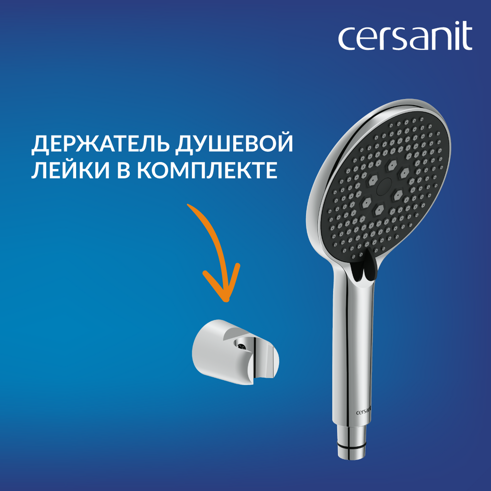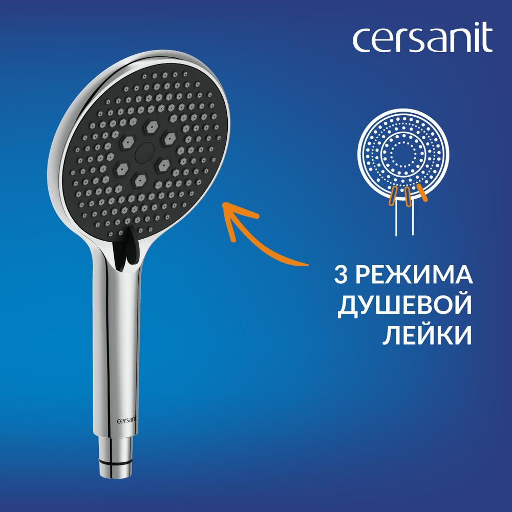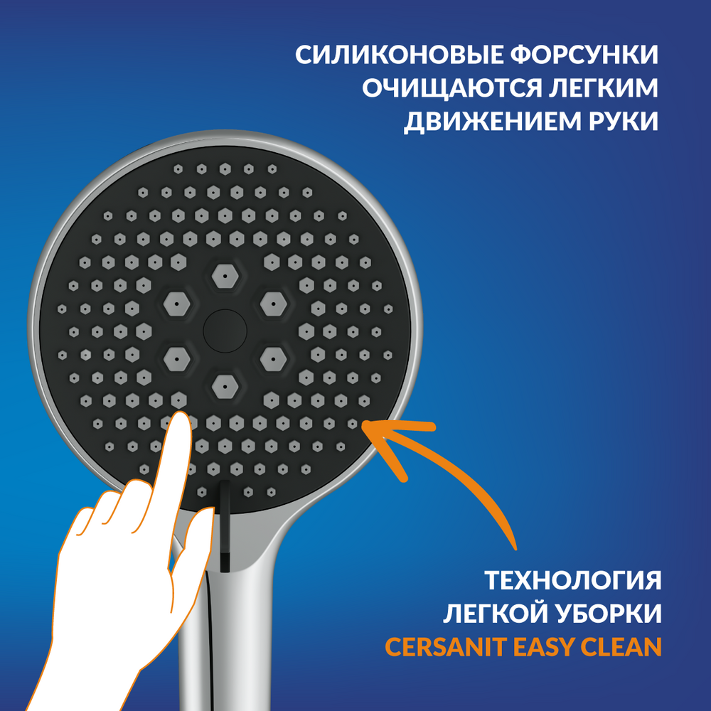 Система оснащена крупной душевой лейкой с 3 режимами, которую можно установить на удобной высоте. Технология Cersanit Easy Clean обеспечивает быстрое очищение силиконовых форсунок от известкового налета. Для этого достаточно просто провести пальцами по форсункам.