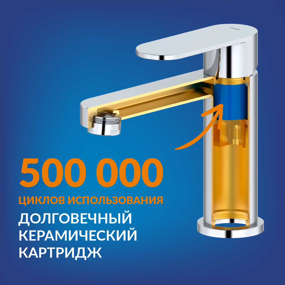 Керамический картридж, рассчитанный на 500 тыс. циклов открывания и закрывания, будет служить минимум 5 лет по гарантии. Благодаря нему происходит точное смешивание воды.