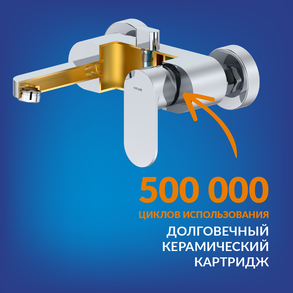 Смеситель оснащён керамическим картриджем, рассчитанным на 500 тыс. циклов открывания и закрывания. Благодаря ему вода точно смешивается даже при плохом напоре. Гарантия на этот элемент составляет 5 лет. Вода переключается с крана на душевую лейку с помощью дивертора плавным поворотом, что добавляет комфорта процедурам.