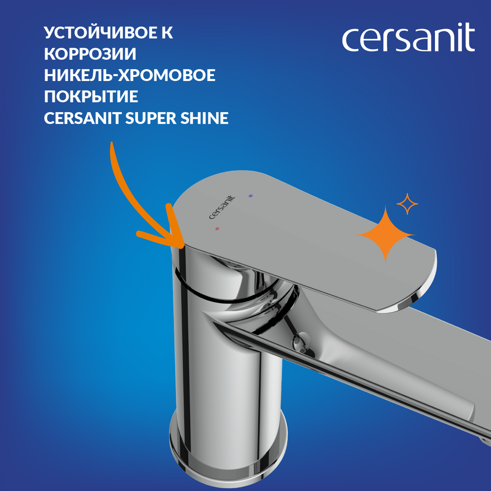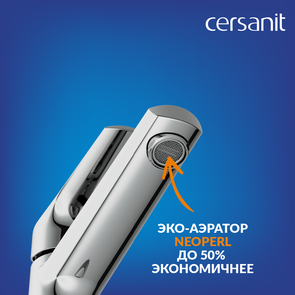 За никель-хромовым покрытием Cersanit Super Shine просто ухаживать. Его стойкий блеск досказан тестами в нейтральной солевой среде. Смеситель оснащен аэратором Eco Neoperl, который подает 6 литров в минуту и позволяет экономить до 50% воды.