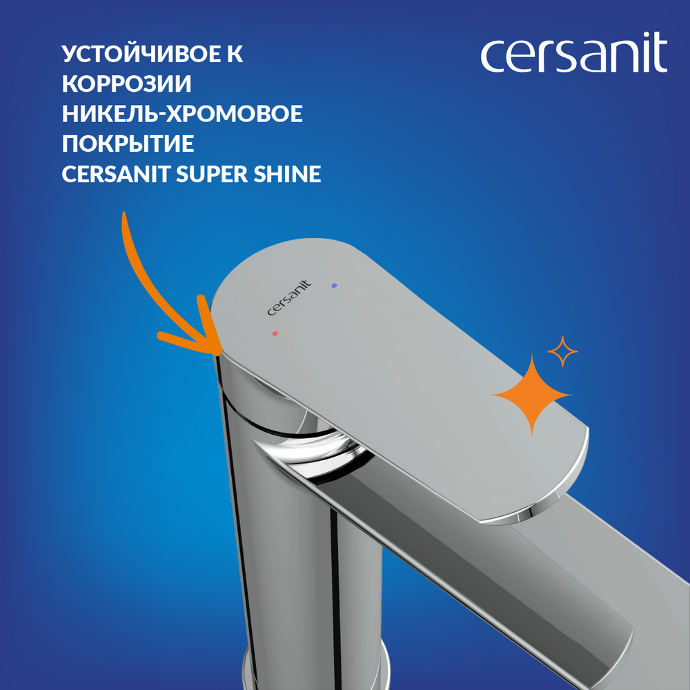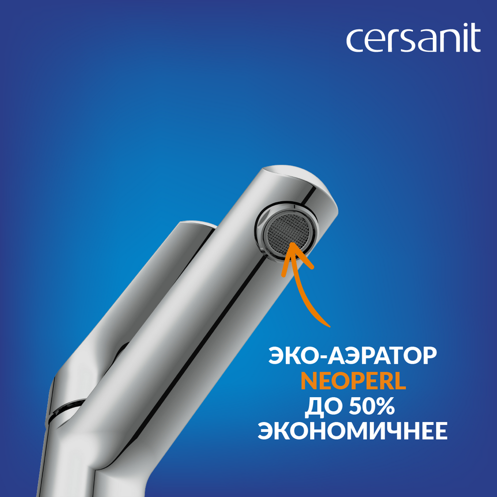 Никель-хромовое покрытие Cersanit Super Shine просто в уходе. Его стойкий блеск досказан многочасовыми тестами в нейтральной солевой среде. Для экономии до 50% воды смеситель оснащен аэратором Eco Neoperl, который пропускает 6 литров в минуту и бережет семейный бюджет.