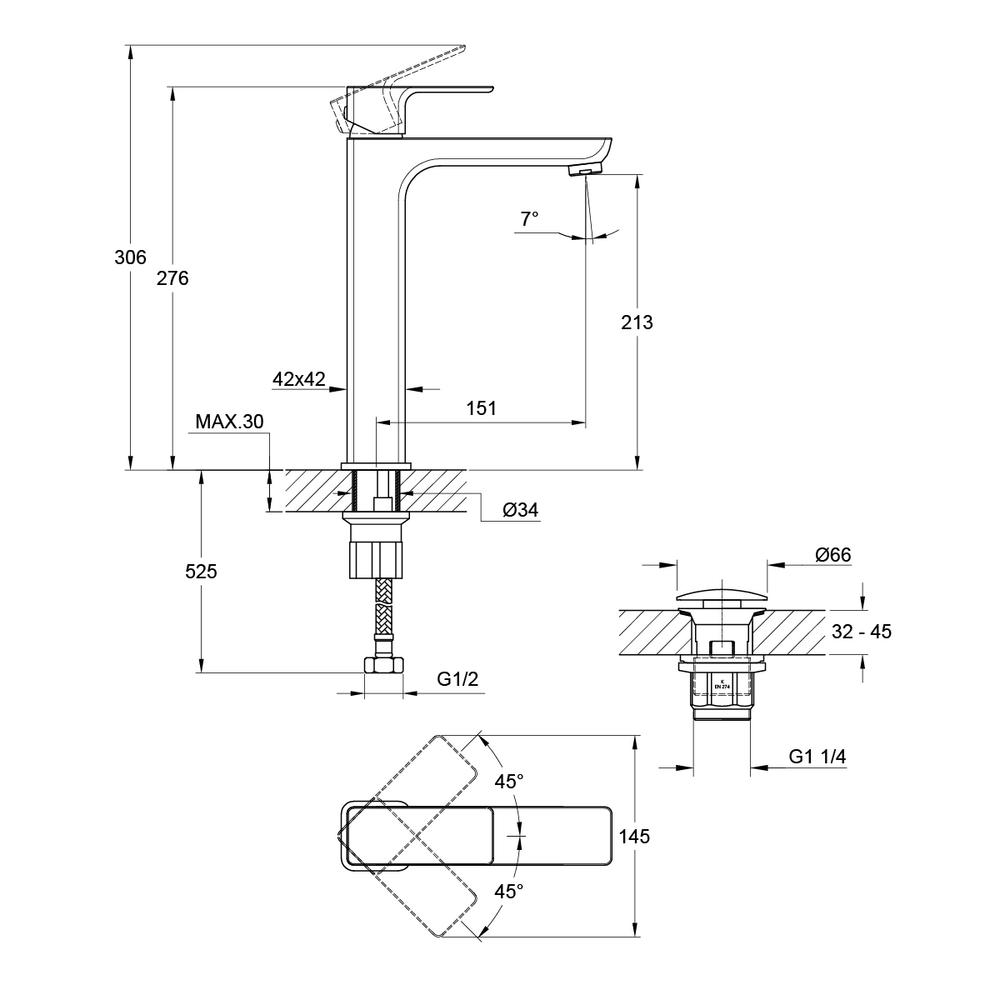 смеситель, донный клапан (PVC), декоративные накладки, S-образные эксцентрики, гарантийный талон, инструкция по эксплуатации