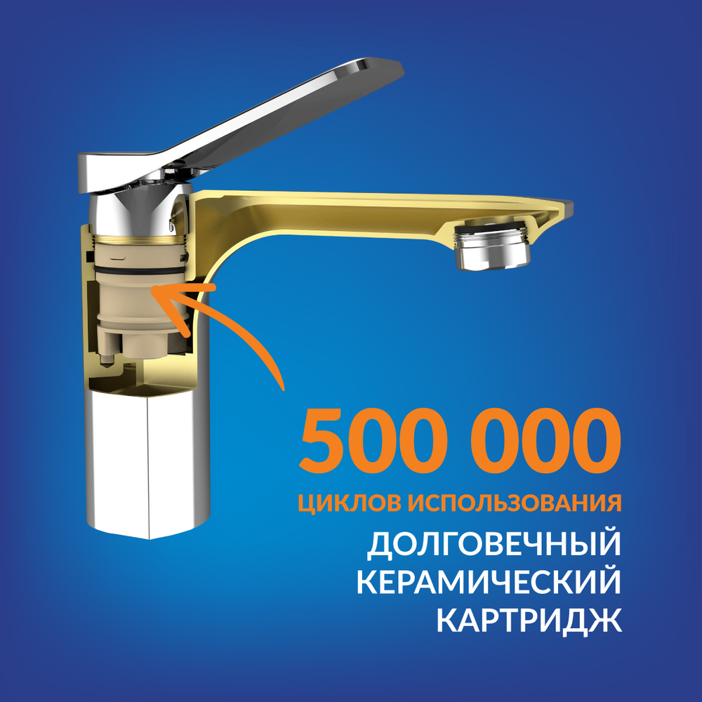 Внутри смесителя керамический картридж, рассчитанный на 500 тыс. циклов открывания и закрывания. Даже при плохом напоре он точно смешивает воду, обеспечивает особенно плавный ход ручки. Гарантия на картридж — 5 лет.