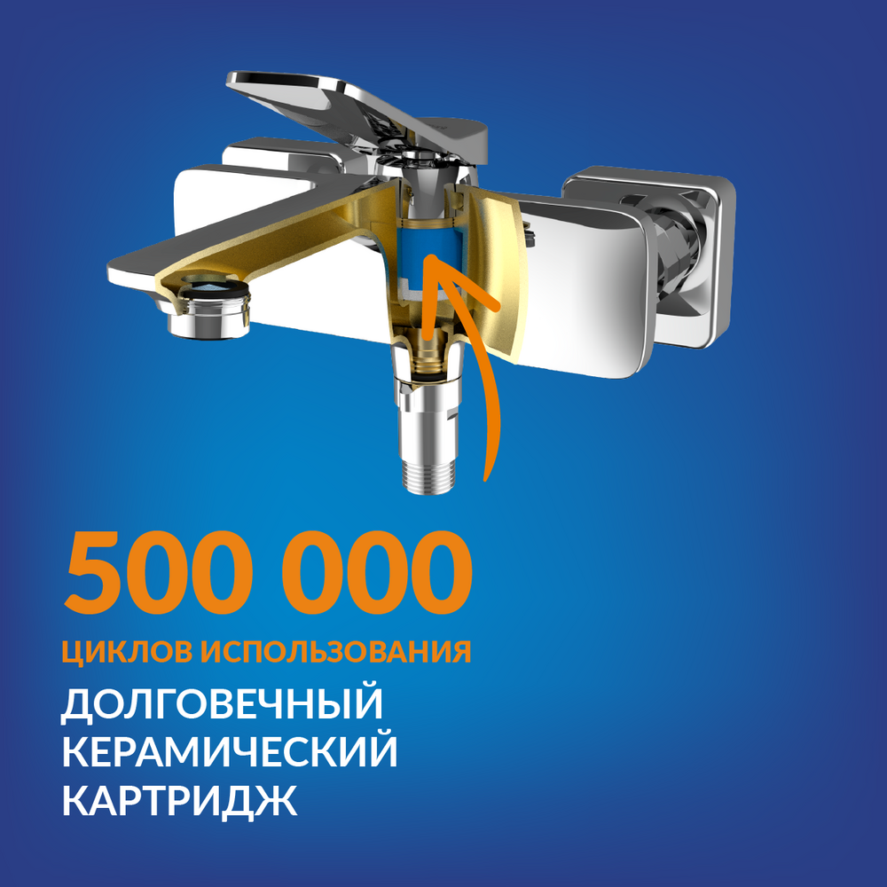 Высокое содержание меди цельнолитого корпуса бережет изделие от коррозии изнутри. Производитель уверен в качестве продукции, поэтому даёт гарантию 12 лет на латунный корпус. Также смеситель оснащен керамическим картриджем, рассчитанным на 500 тыс. циклов открывания и закрывания. Он точно смешивает воду даже при плохом напоре, обеспечивает особенно плавный ход ручки. Гарантия на этот элемент — 5 лет.