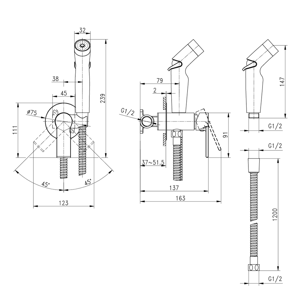 рукоятка, лейка гигиенического душа, подключение для шланга, шланг в металлической оплетке 1/2" 120см, паспорт изделия с гарантийным талоном, инструкция по эксплуатации