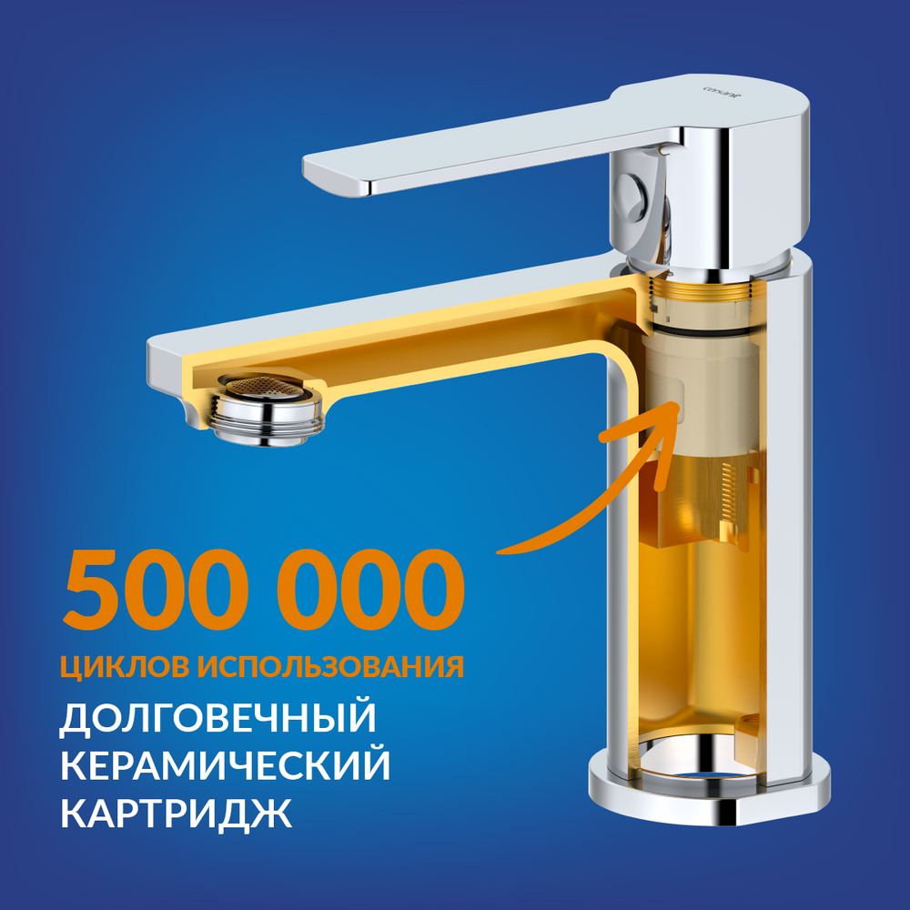 Качественный керамический картридж с гарантией 5 лет обеспечивает плавный ход ручки и абсолютную точность регулировки температуры и напора воды. Он рассчитан на 500 тыс. циклов открытия и закрытия, чего хватает на долгие годы.